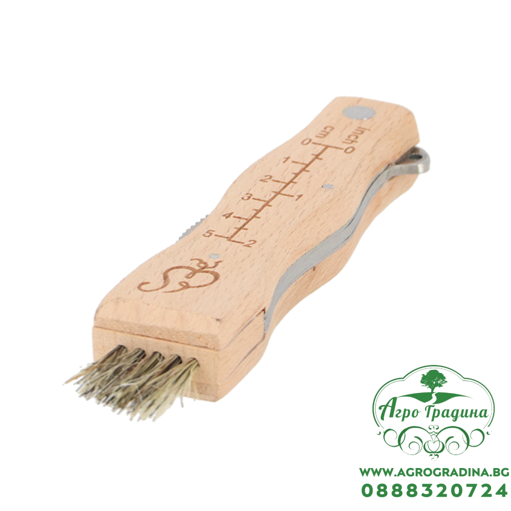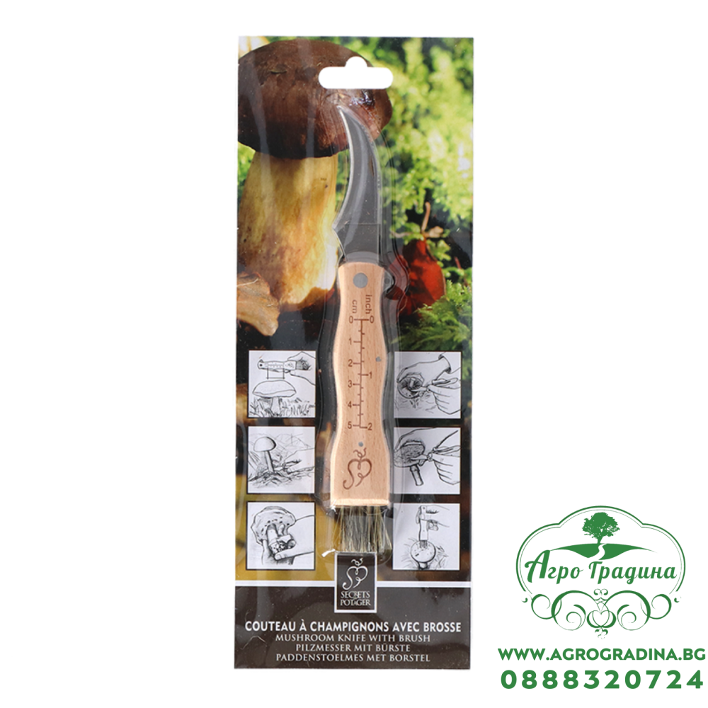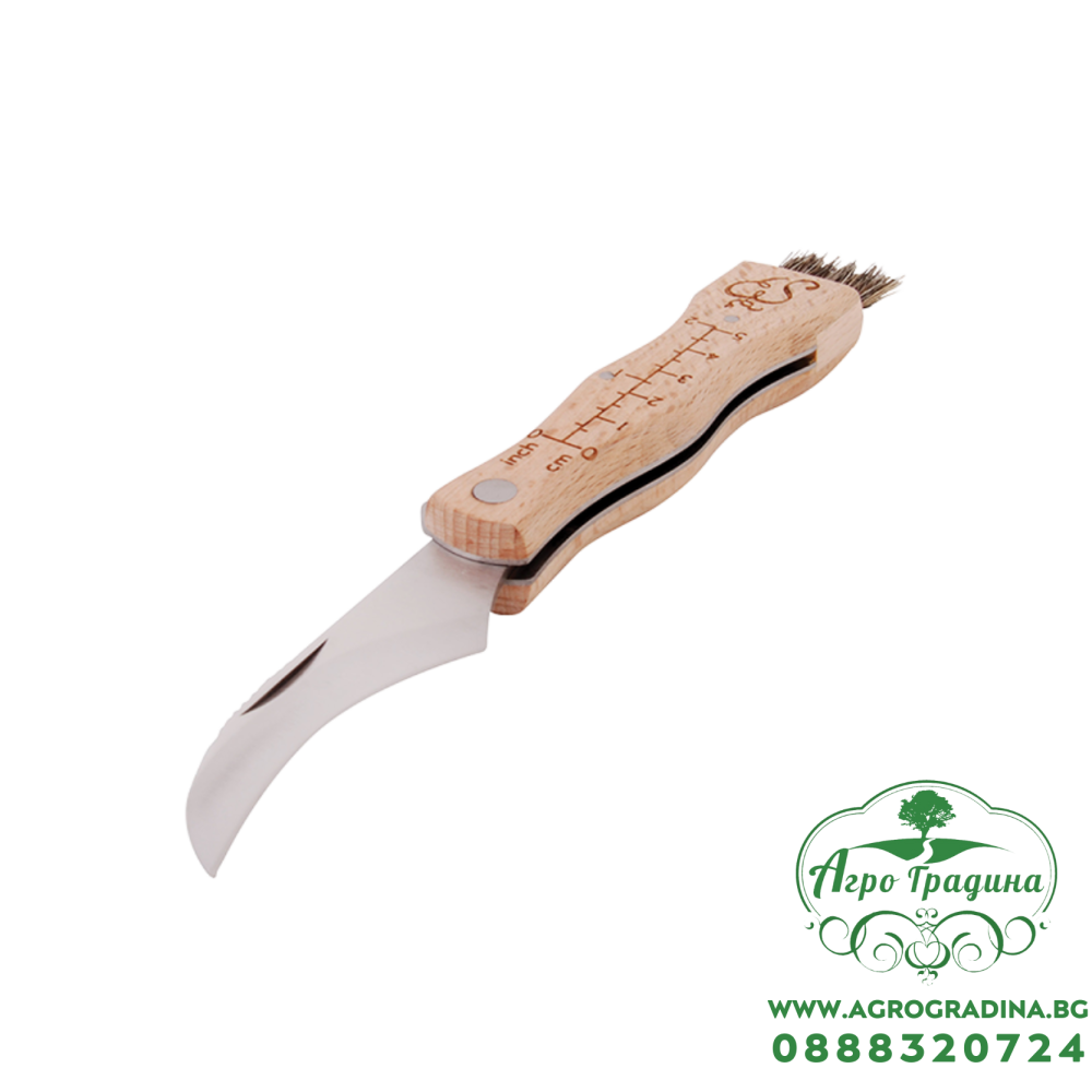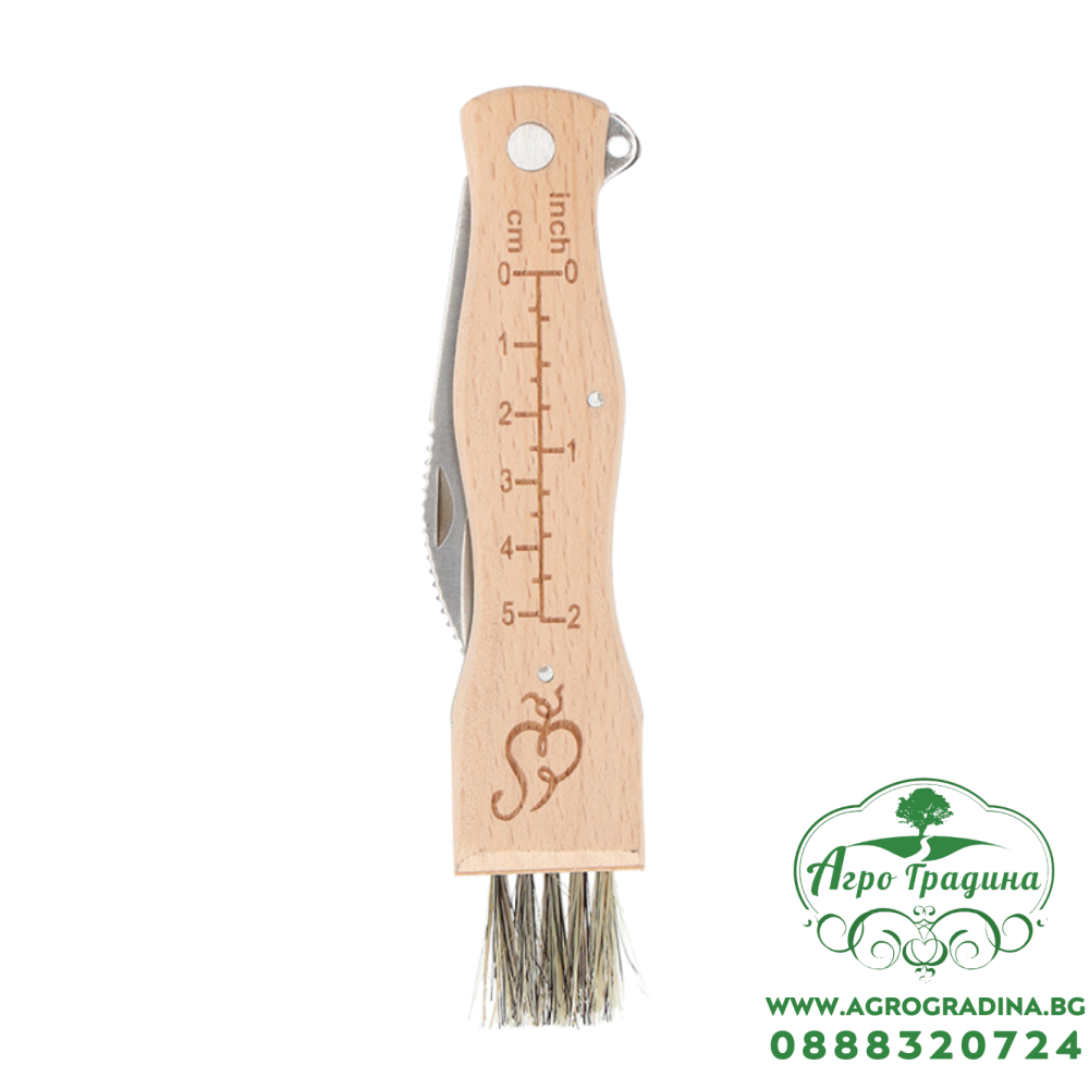 Този класически сгъваем нож за гъби е проектиран с цел лесно отделяне на капачката на гъбата от стъблото, благодарение, на което се предотвратява повреждането на мицела. Четката на ножа, направена от свинска четина, е предназначена за отстраняване на външния слой на гъбата, като същевременно може да се почисти на мястото с вградената четка. Дървената дръжка, изработена от буково дърво, допълнително е оборудвана с линия, която ви позволява да измервате размера на събраните гъби.