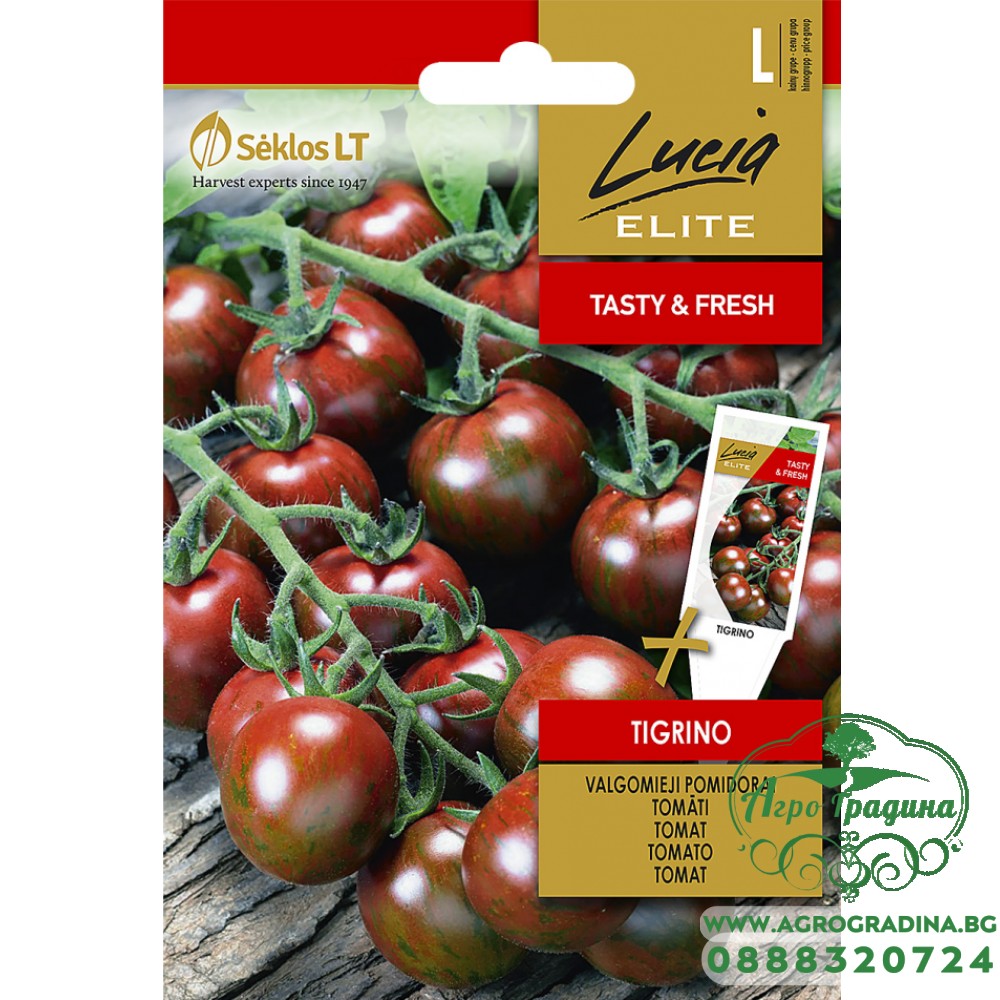 Тигрино е висок сорт, ценен заради оригиналния си цвят, много сладките и ароматни плодове. Плодът тежи 16-20 гр, на една чепка растат 14 плода. Те узряват почти едновременно на чепката, така че плодовете на този сорт могат да се берат на чепки. Подходящ за отглеждане в оранжерии, балкони, а при отглеждане на открито изберете слънчево, топло място, защитено от вятъра. За да могат семената да покълнат по-бързо и по-равномерно, реколтата се покрива със стъкло или филм. Температурата на субстрата, в който се засяват семената, не трябва да бъде по-ниска от +21-26 °C, температурата на помещението не трябва да бъде по-ниска от +23 °C. Разсадът се засажда в оранжерията, когато вече няма опасност от замръзване. При засяване на семена трябва да се използват 15-20 на 100 повече от планираното за отглеждане на разсад. 0,1 гр - около 40-50 семена. 0,1 гр ще бъде достатъчно за площ от 25 м2 - прогнозираният добив при благоприятни условия на отглеждане е до 20-28 кг.
