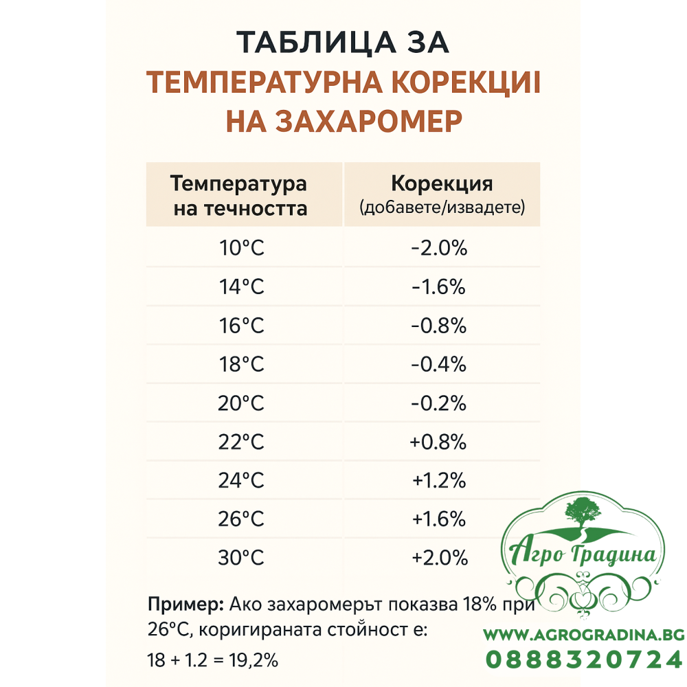 Пример: Ако захаромерът показва 18% при 26°C, коригираната стойност е: 18 + 1.2 = 19.2%.