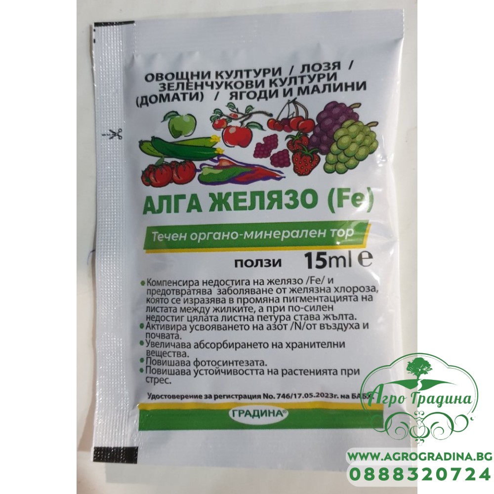 Онлайн магазин agrogradina.bg представя Алга Желязо (Fe) / - течен органо-минерален тор, подходящ за ОВОЩНИ КУЛТУРИ / ЛОЗЯ / ЗЕЛЕНЧУКОВИ КУЛТУРИ (ДОМАТИ) / ЯГОДИ И МАЛИНИ. Ползи: