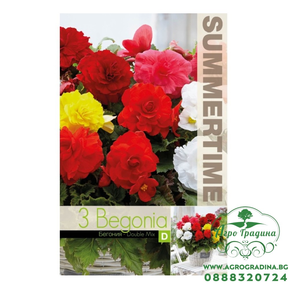 Онлайн магазин agrogradina.bg предлага грудки за микс от различни цветове двойна (кичеста) Бегония / Begonia tuberhybrida - декоративни растения, известни с красивите си, големи цветове и ярки багри, вариращи от бяло, розово и жълто до оранжево и червено.