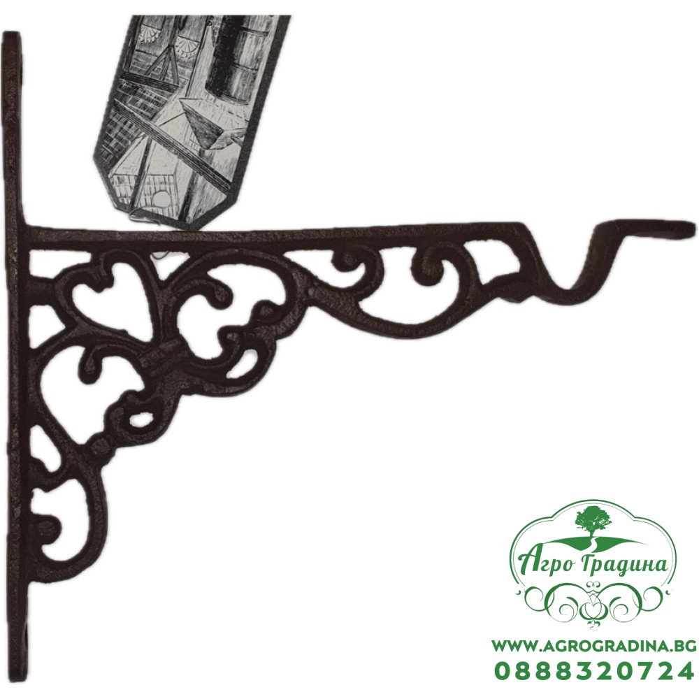 Онлайн магазин agrogradina.bg представя чугунена конзола с орнаменти, подходяща за окачване на фенери, хранилки, висящи кошници.