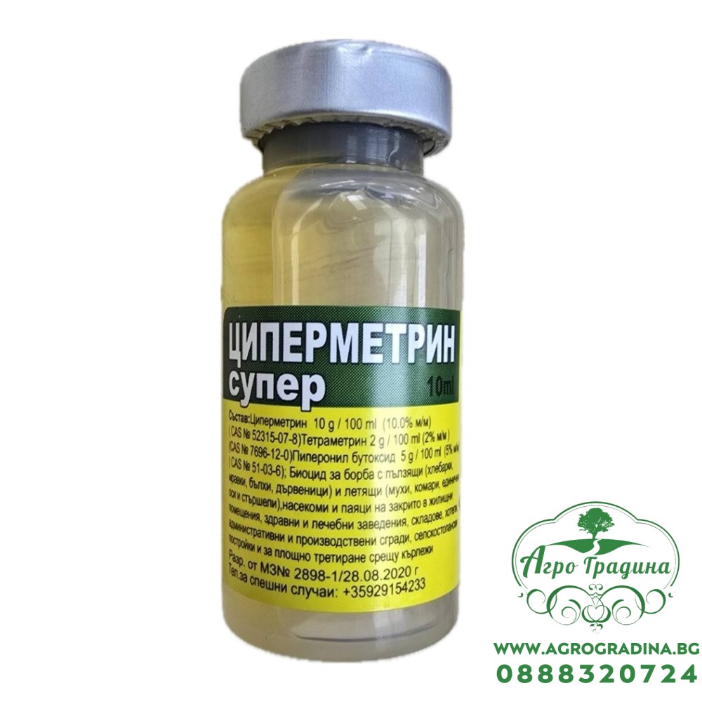 Циперметрин Супер е високоефективен течен инсектицид за борба с широка гама от вредители – хлебарки, мравки, дървеници, бълхи, мухи, комари и други. Съдържа три активни вещества: циперметрин (10%), тетраметрин (2%) и пиперонил бутоксид (5%), които осигуряват бърз и дълготраен ефект.