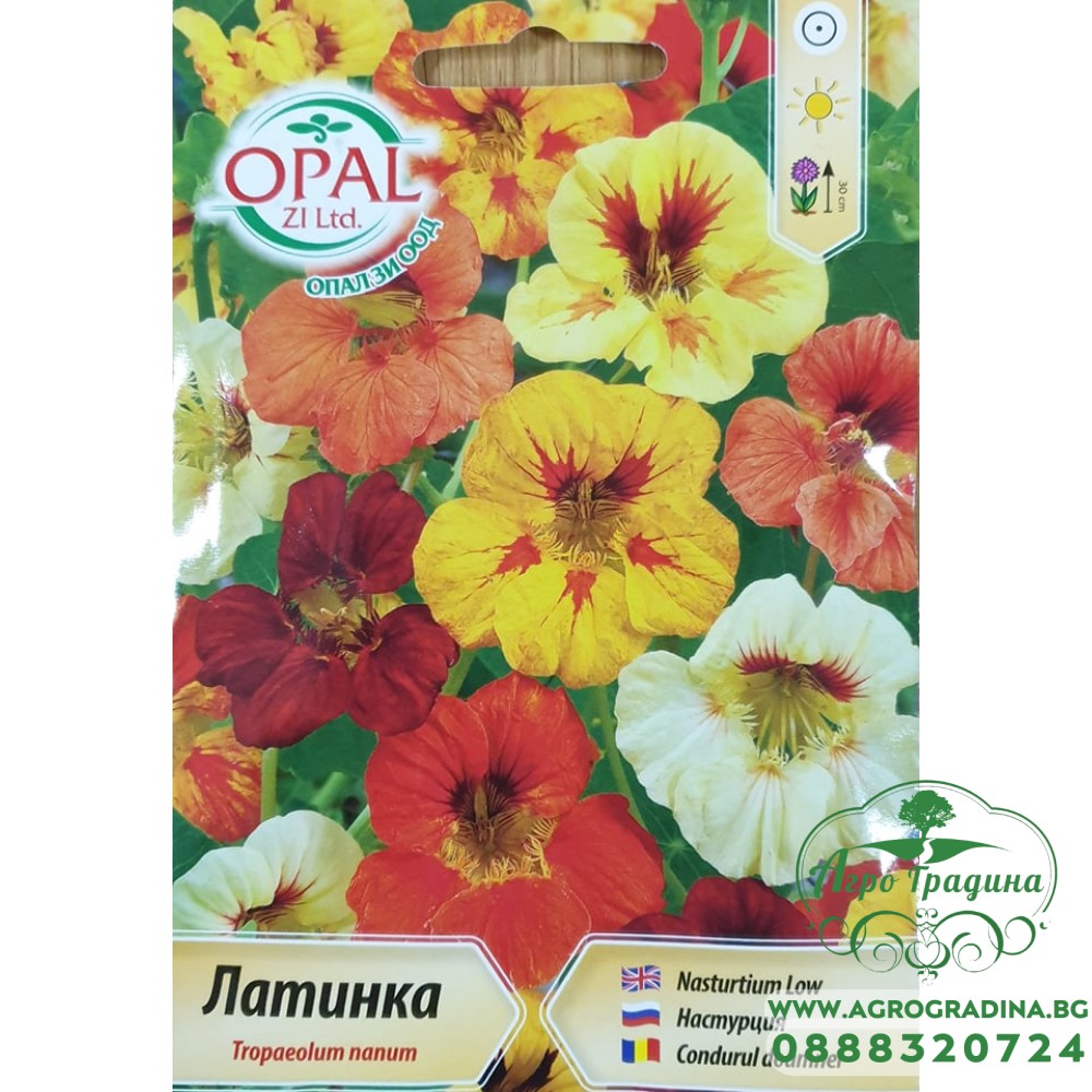 Латинка ниска микс Едногодишно растение с височина 30см. Предпочита слънчеви изложения. Подходящо е за украса на цветни петна в градини, бордюри, балконски висящи саксии и сандъчета. Засявайте семената директно м.Апр... Прочети повече...