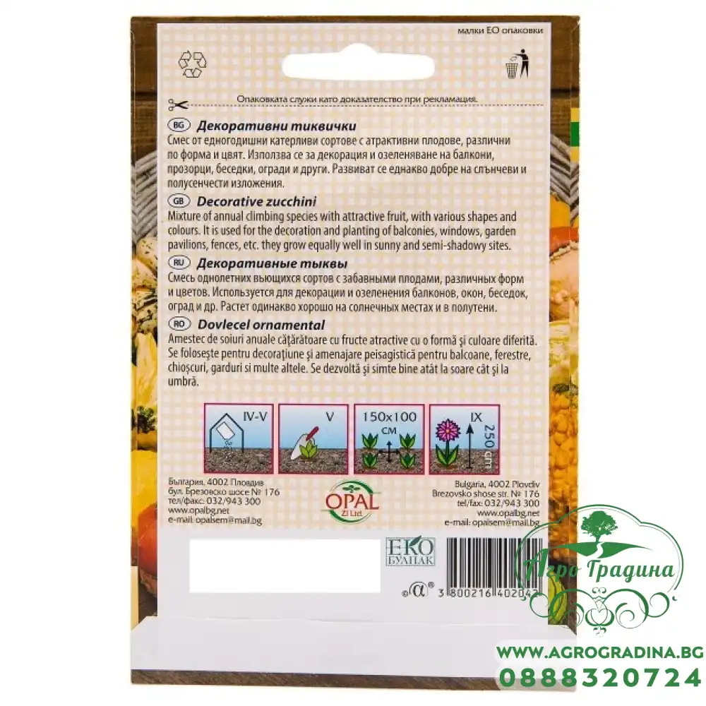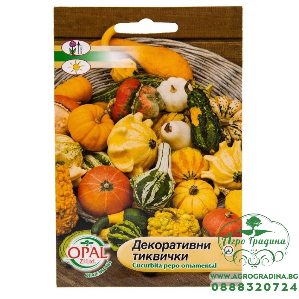 Микс от декоративни тиквички с различни форми и цветове. Готовите растения се нуждаят от подпорки. Когато са добре узрели и изсъхнали плодовете запазват външния си вид в продължение на месеци. Подходящи за декорация.