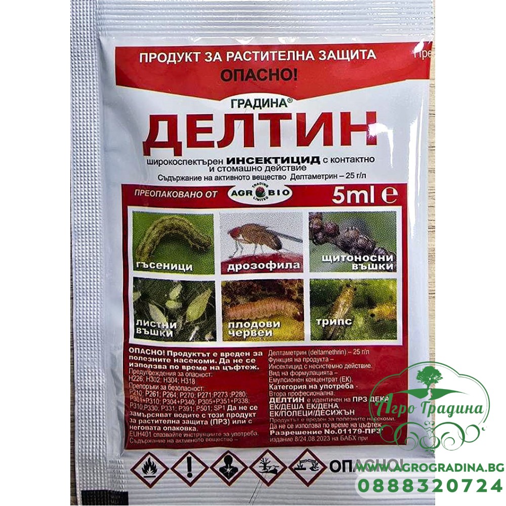Делтин 5 мл е широкоспектърен инсектицид с контактно и стомашно действие, предназначен за борба с разнообразни вредители по селскостопански и градински култури. Продуктът съдържа активното вещество делтаметрин (25 гр/л), което осигурява бързо инициално действие и продължителна защита на растенията.