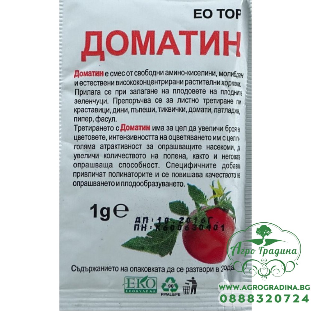 Доматин е специализиран биостимулатор, съдържащ свободни аминокиселини, молибден и висококонцентрирани растителни хормони. Прилага се при залагане на плодовете на зеленчукови култури, като съдържание на цвят, увеличава количеството полен и е по-добро за опрашване и плодообразуване.