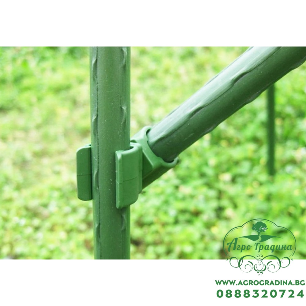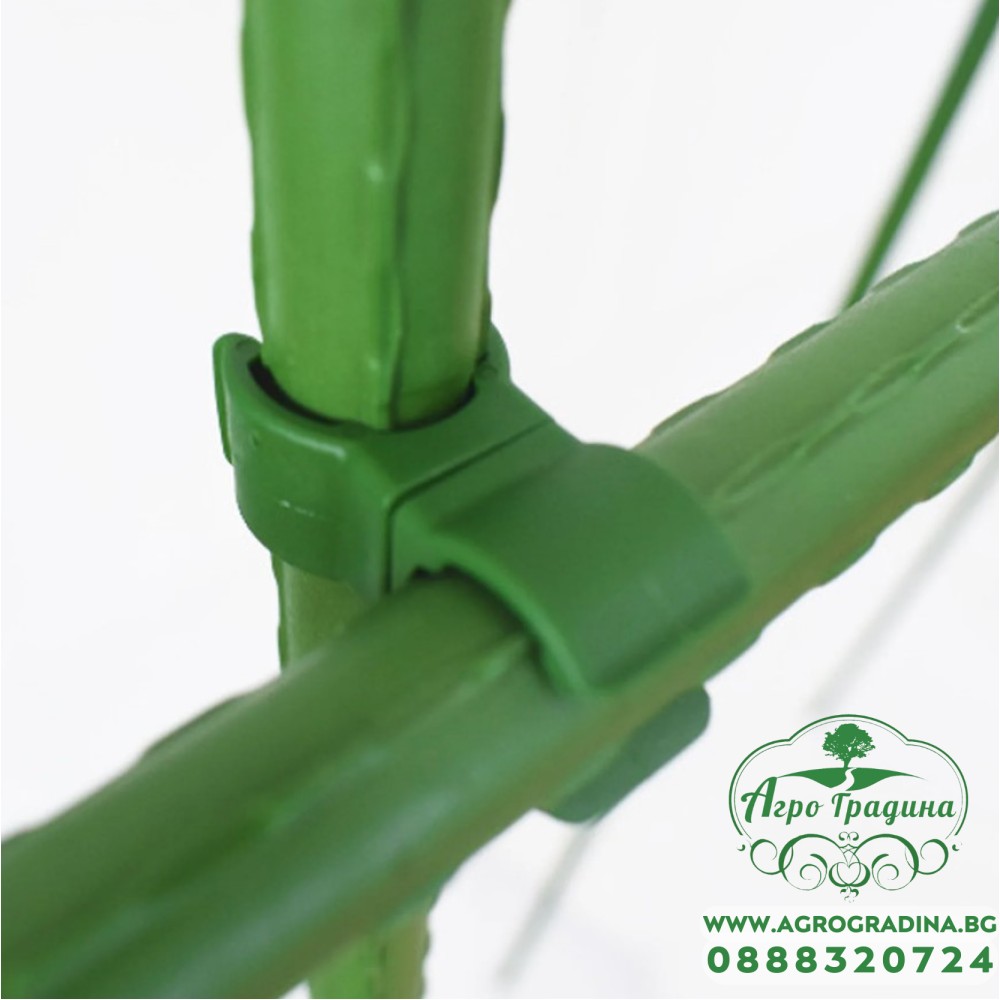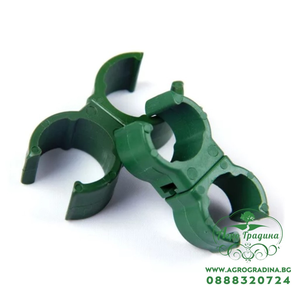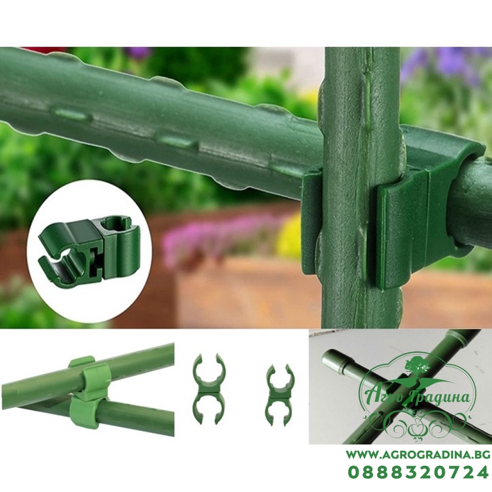 Двустранни въртящи се на 360 ° скоби, предназначени за лесно и здраво съединение на PVC колчета. Изработени от устойчива пластмаса с UV защита. Използва се за свързване и закрепване на опори за растения. Идеални за поддържане на растения като домати, краставици, фасул и други високорастящи култури.
