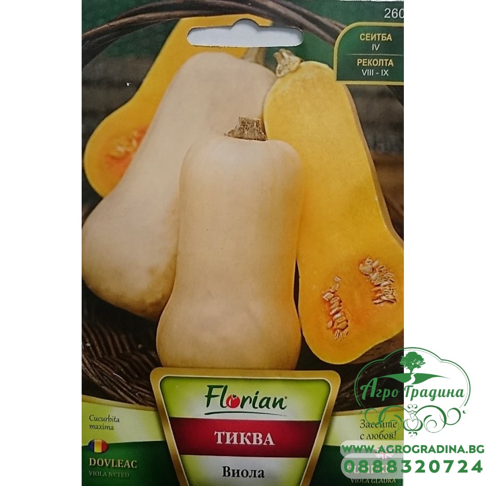 Нашият он-лайн магазин представя на вашето внимание семена за Тиква сорт Виола гладка. Този сорт тиква е известен още сред хората като цигулка но с гладка кора.