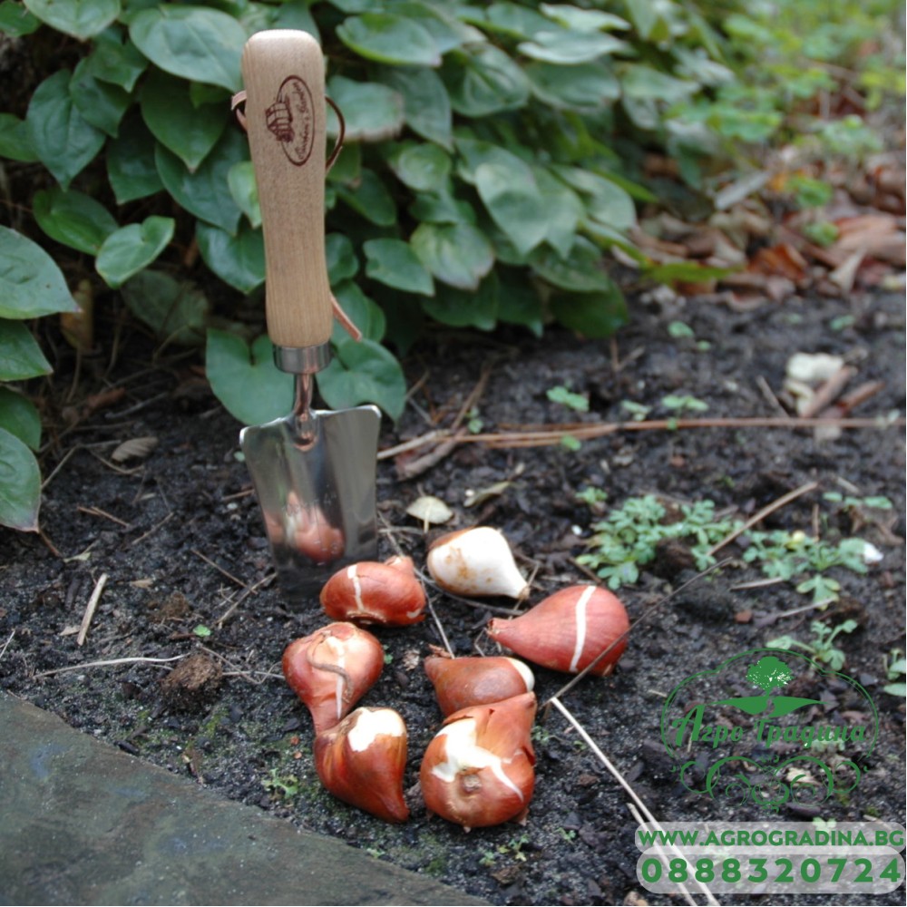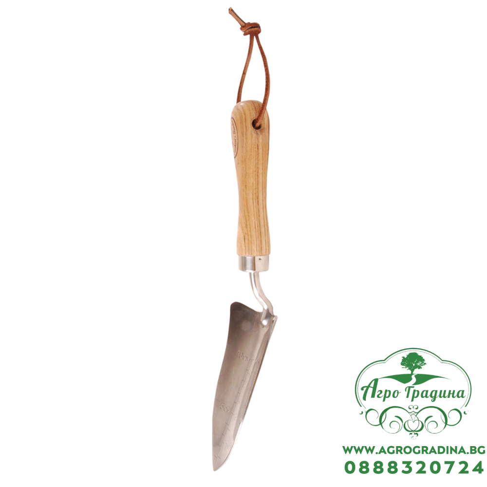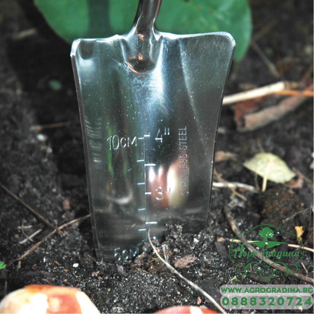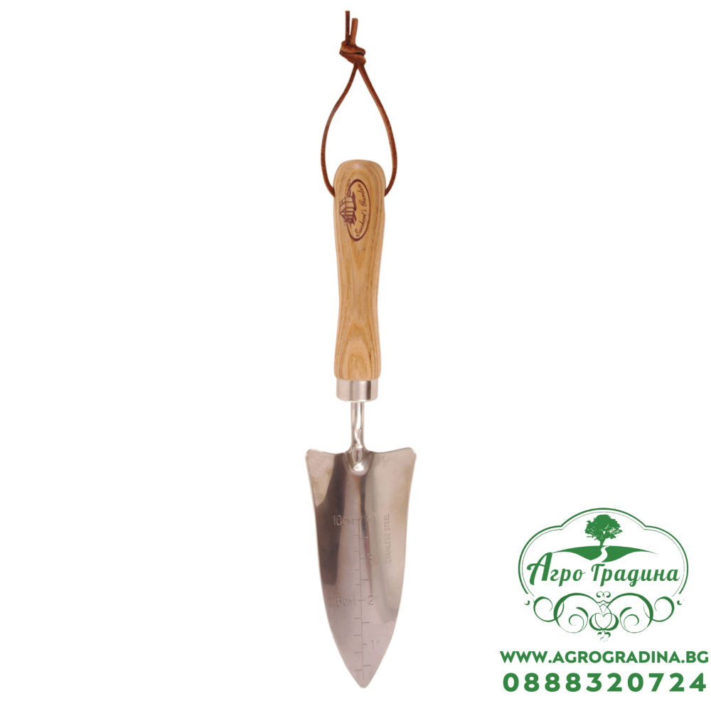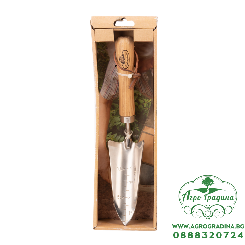 Изработeна от висококачествена неръждаема стомана, тази лопатка е изключително здрава и издръжлива. Снабдена е с остър връх, който значително улеснява проникването в почвата. В допълнение, ергономичната дръжка от дърво осигурява не само удобен захват, но и допълнителна сила при използване. Този инструмент се отличава със специална полезност при засаждането на луковици. Върху лопатата е изгравирана скала в сантиметри и инчове, която значително помага при точното и безпроблемно поставяне на луковиците на желаната дълбочина. На дръжката на лопатата има поставена кожена примка за окачване.