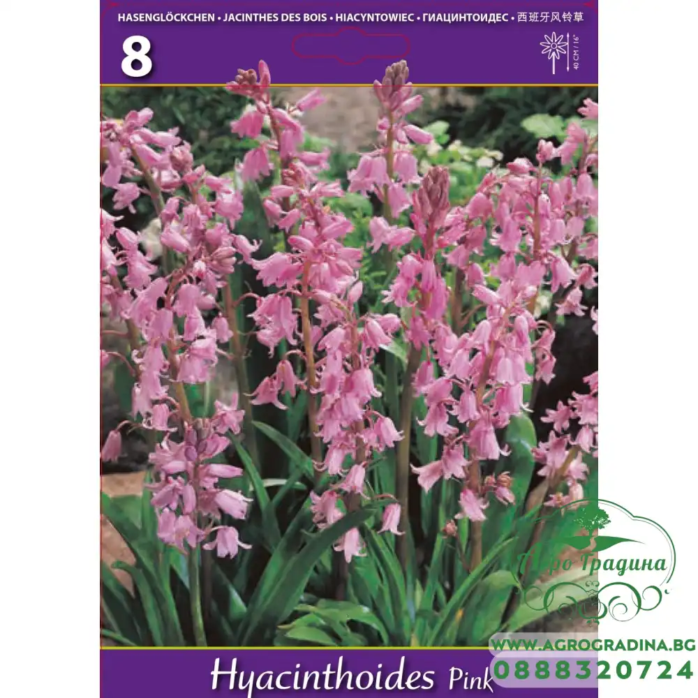 Онлайн магазин agrogradina.bg предлага 8 броя луковици за Лъжезюмбюл Розова камбанка / Hyacinthoides pink, известен още като Испанска камбанка (Spanish bluebell) и Дървесен зюмбюл (Wood Hyacinth), е красиво многогодишно луковично растение с изящни розови цветове.