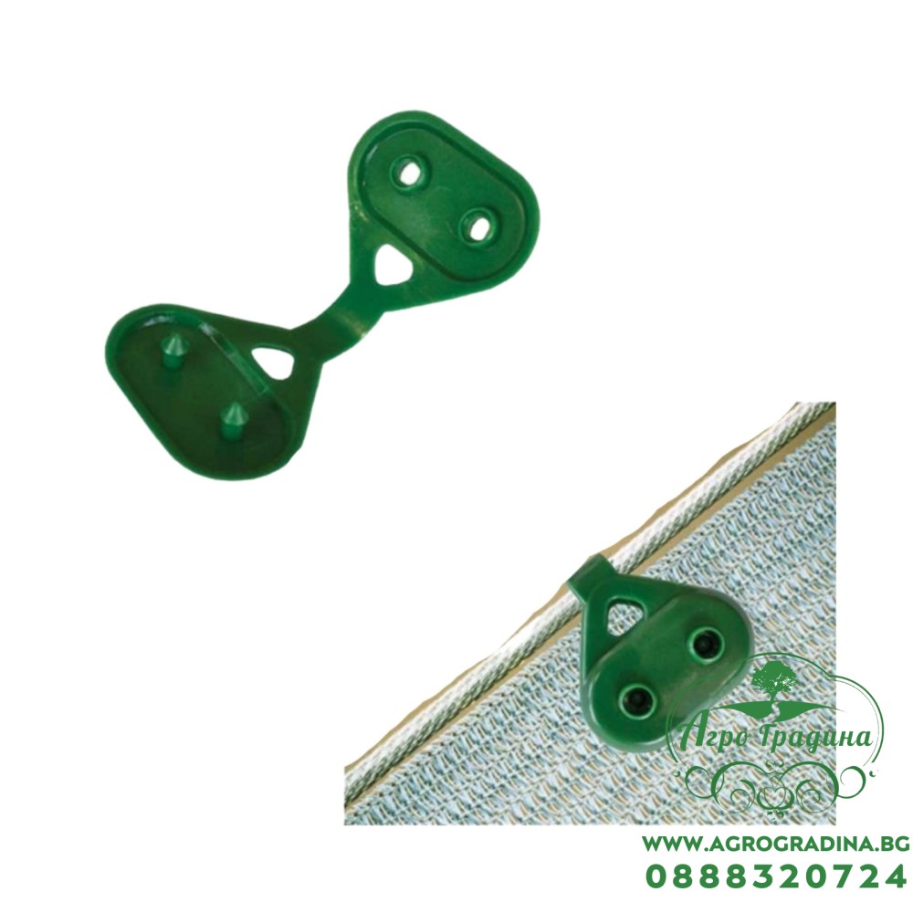 Приложение: За опъване на засенчващи и предпазни плетени мрежи. С отвор за прокарване на въже Ф7 мм. За многократна употреба