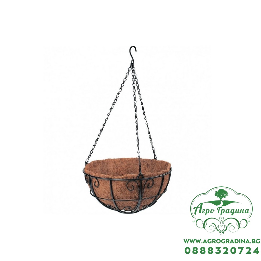 Конструкцията е изработена от верижка и кука от ковано желязо позволява бързото и сигурно закачане. Кокосовите влакна не задържат излишна влага в саксията.