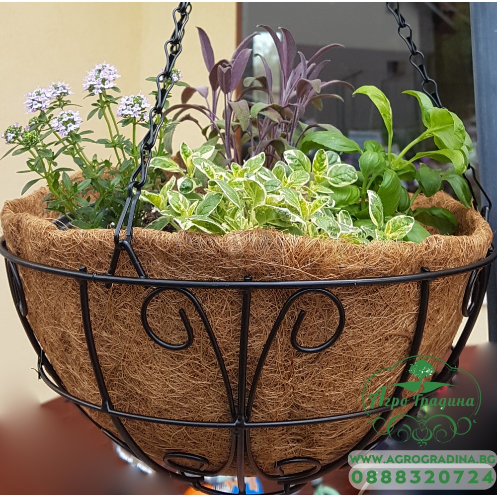 Придайте специфичен стил на Вашата градина с детайло изработена от ковано желязо кашпа и саксия от кокосови влакна. Практична и лесна за закачане и преместване.