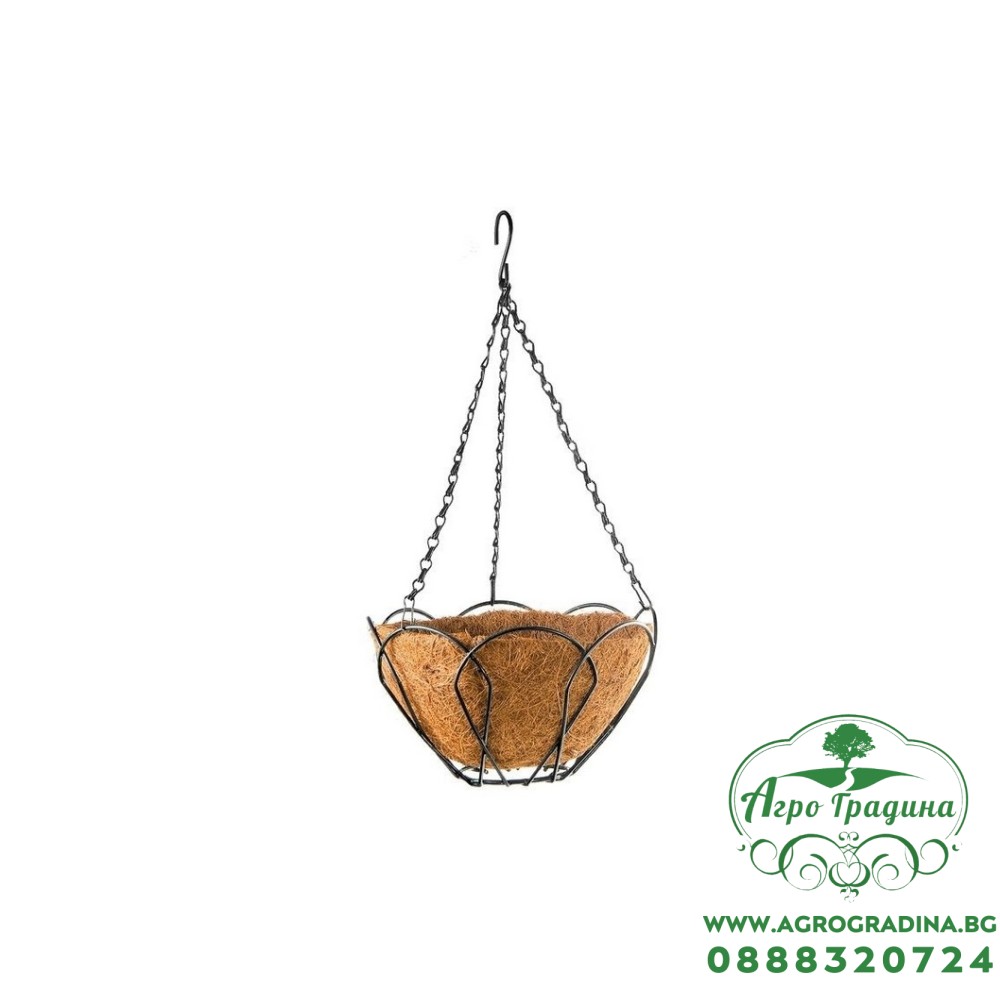 Конструкцията е изработена от верижка и кука от ковано желязо позволява бързото и сигурно закачане. Кокосовите влакна не задържат излишна влага в саксията.