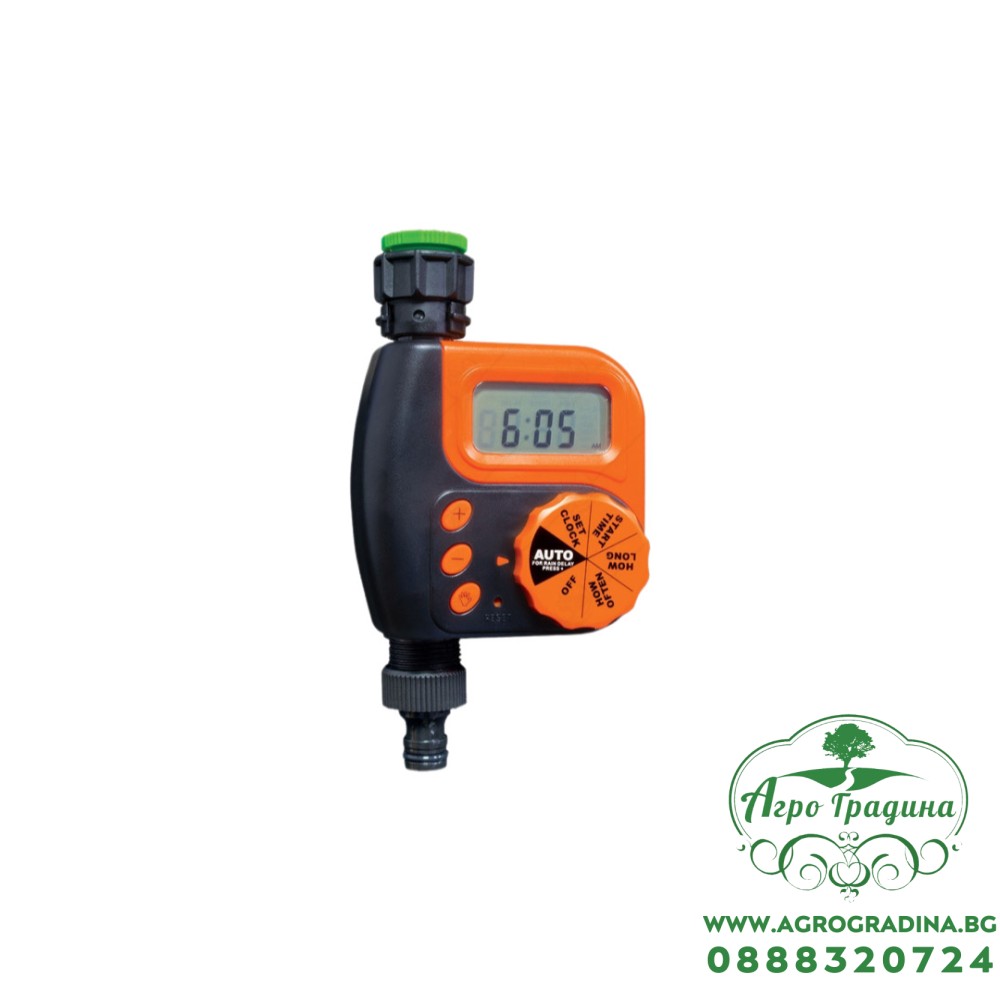 Ритъм на поливане от всеки ден до веднъж седмично, от 1 минута до 5 часа. Възможност за ръчно поливане и отлагане на поливането. Лесно програмиране чрез въртящият се превключвател. Таймерът е подходящ за кран с резба 3/4". Работи с батерии 2АА /не са включени в опаковката/. Метален филтър на входа за вода. Необходимо налягане при работа 1.8 bar.