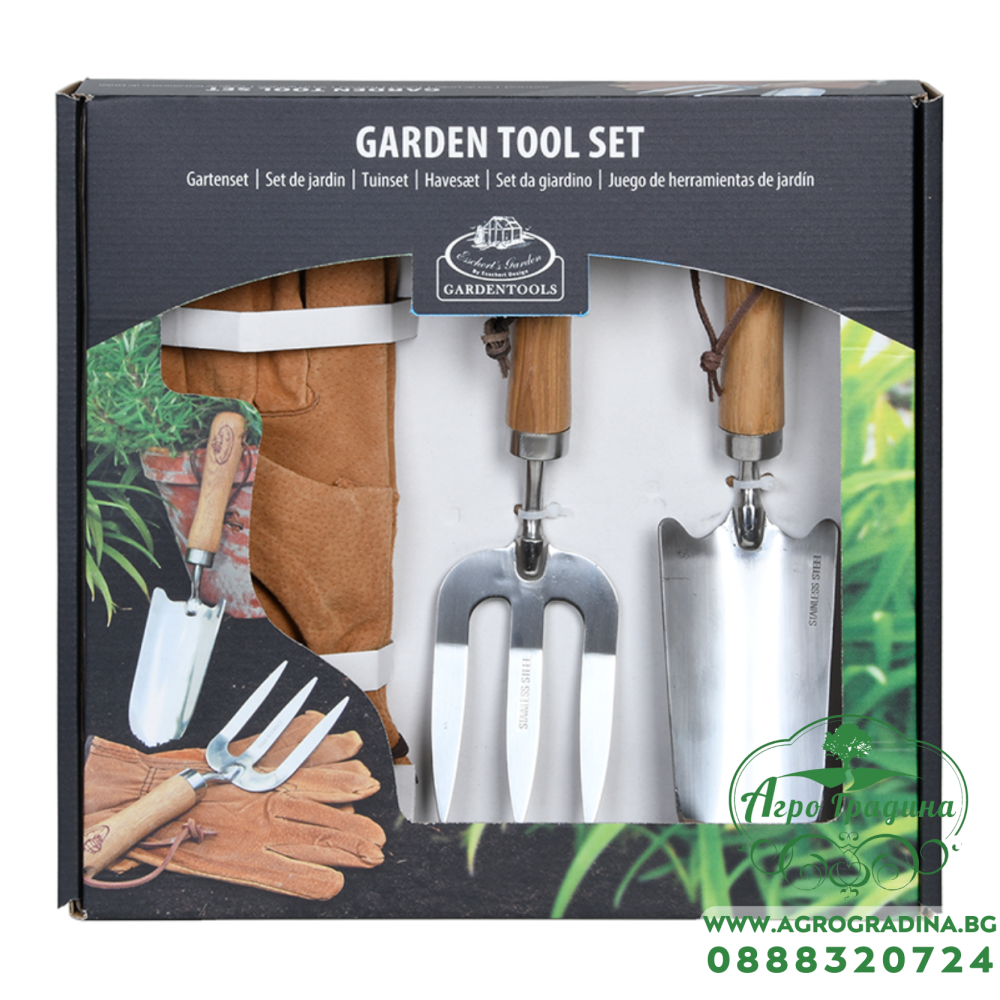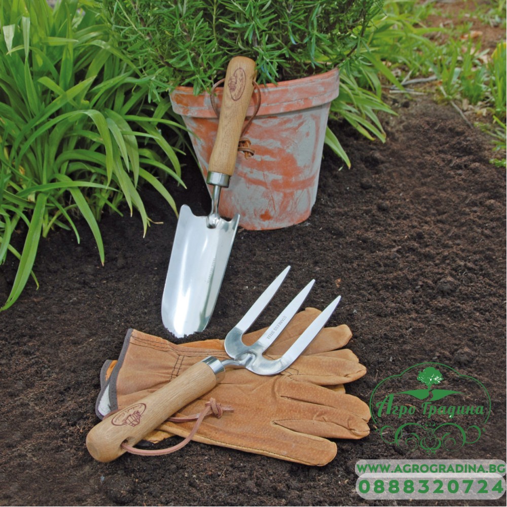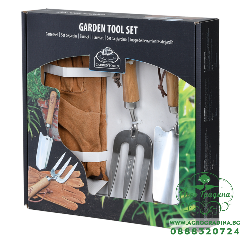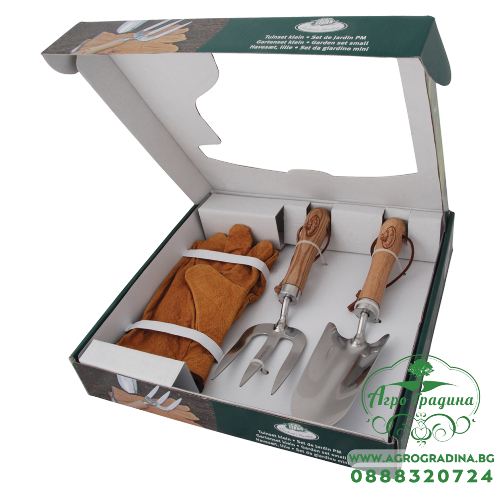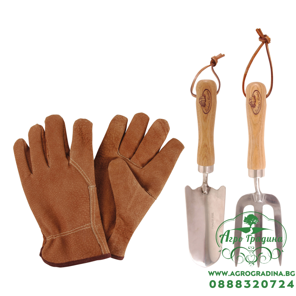 С този удобен комплект, състоящ се от лопатка, култиватор (гребло) и кожени ръкавици, вие имате всичко необходимо за работа в градината. Инстументите са изработени са от висококачествена стомана, удобна дървена дръжка от ясен, с кожена връзка за окачване. Изработката от висококачествена неръждаема стомана, осигурява издръжливост и дълъг живот на инструментите. Здравите ръкавици от свинска кожа с автентично усещане предпазват ръцете от мръсотия.