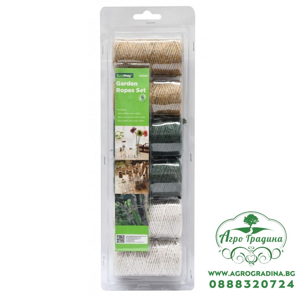 Комплект градински въжета - 6 броя – практично решение за всяка градина и домакинство.Подходящ за връзване на растения, подвързване на домати, краставици и други зеленчуци, както и за различни домакински и декоративни приложения. Въжетата са изработени от естествени материали, здрави и удобни за употреба. Комплекта включва: