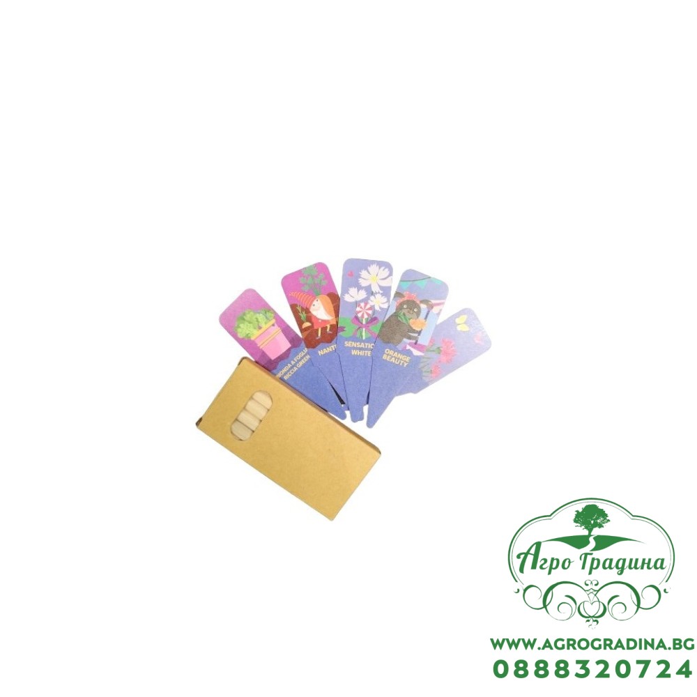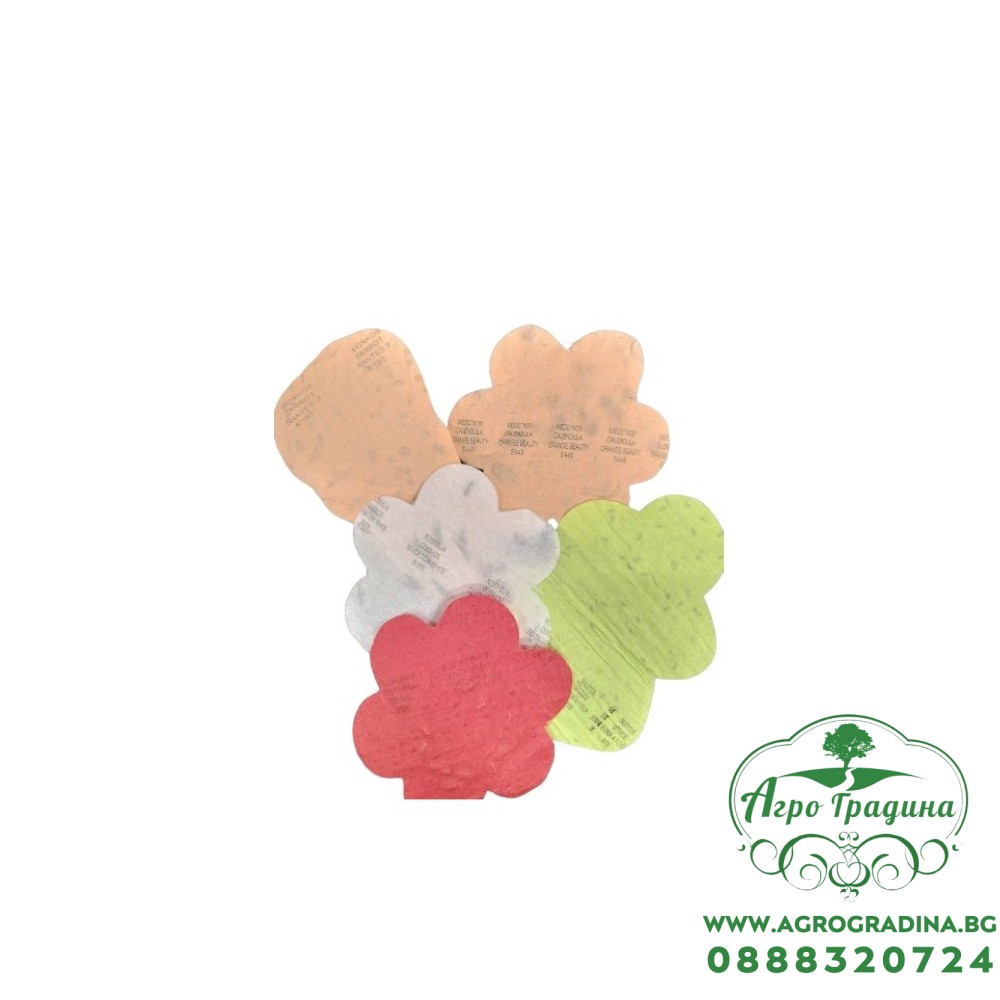 5 броя различни по вид семена, поставени върху подложки с различна форма - моркови, маруля, невен, метличина, цветя космос;