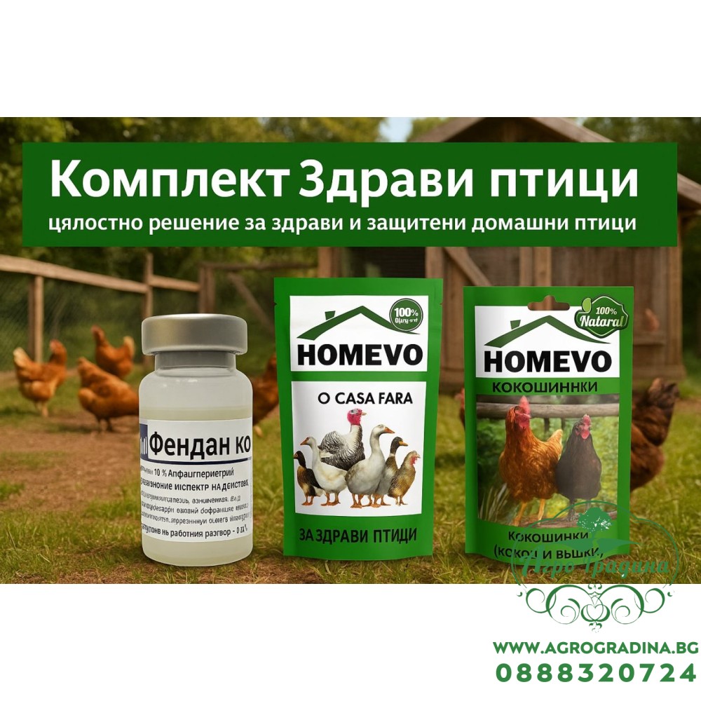 Комплектът включва три естествени препарата за грижа за домашните птици, плюс бързодействащ инсектицид за защита на помещението: