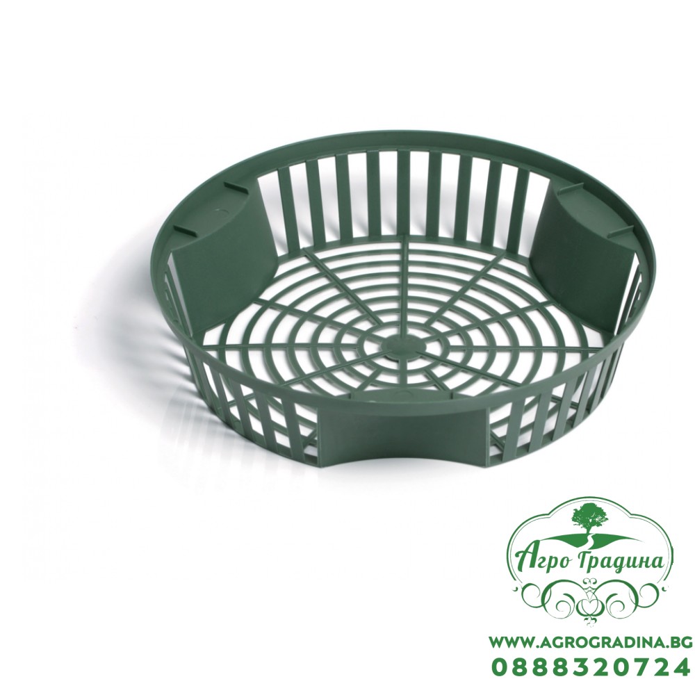 Тази кошница е с диаметър 32 см. Изработена е от висококачествена пластмаса в зелен цвят. Използването на кошници прави лесно и удобно изкопаването на прерасналите цветя или преместването им на друго място в цветната градина. Когато засадите луковици в кошници, ще сте сигурни, че ще засадите луковичния състав на равни разстояния между растенията, а също така е лесен за засаждане и спазване на агротехническите изисквания. Особено подходящо за луковични цветя, засадени през есента. Нещо повече - ще предпази луковиците от вредители (къртици, мишки). Размери: 32х6х32 см.