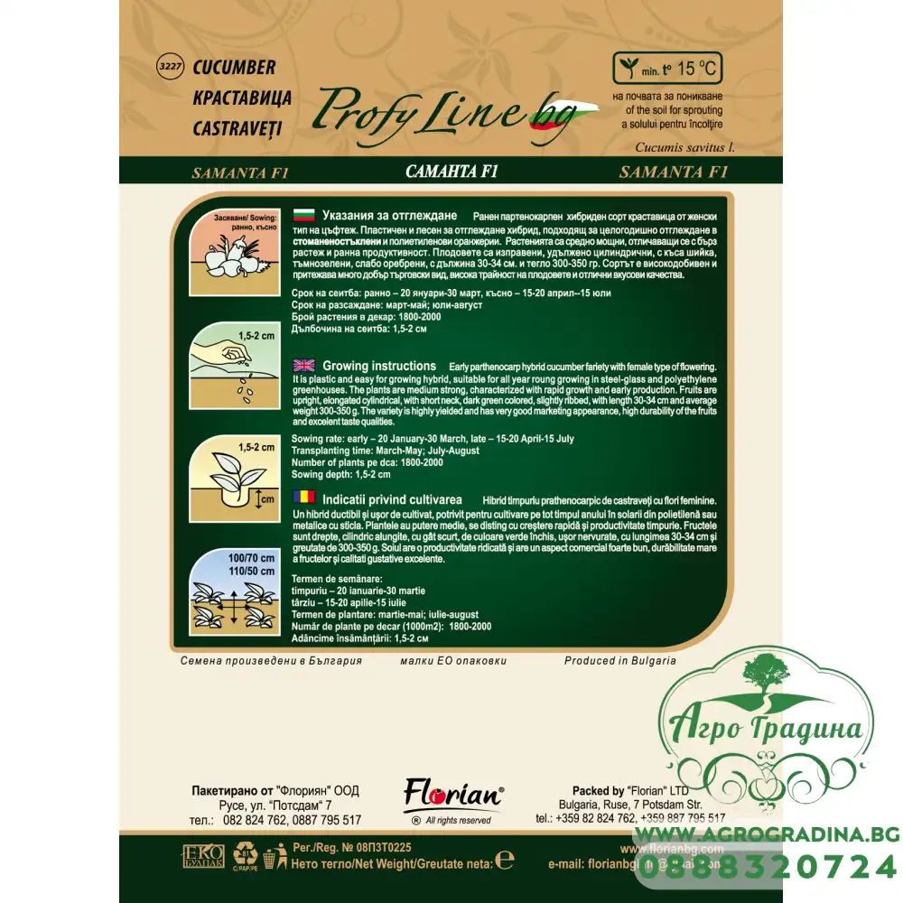 Нашият он-лайн магазин agrogradina.bg представя на вашето внимание семена за краставици сортСаманта F1. Тази оранжерийната краставица се отличава с бързият си растеж и ранното плододаване.