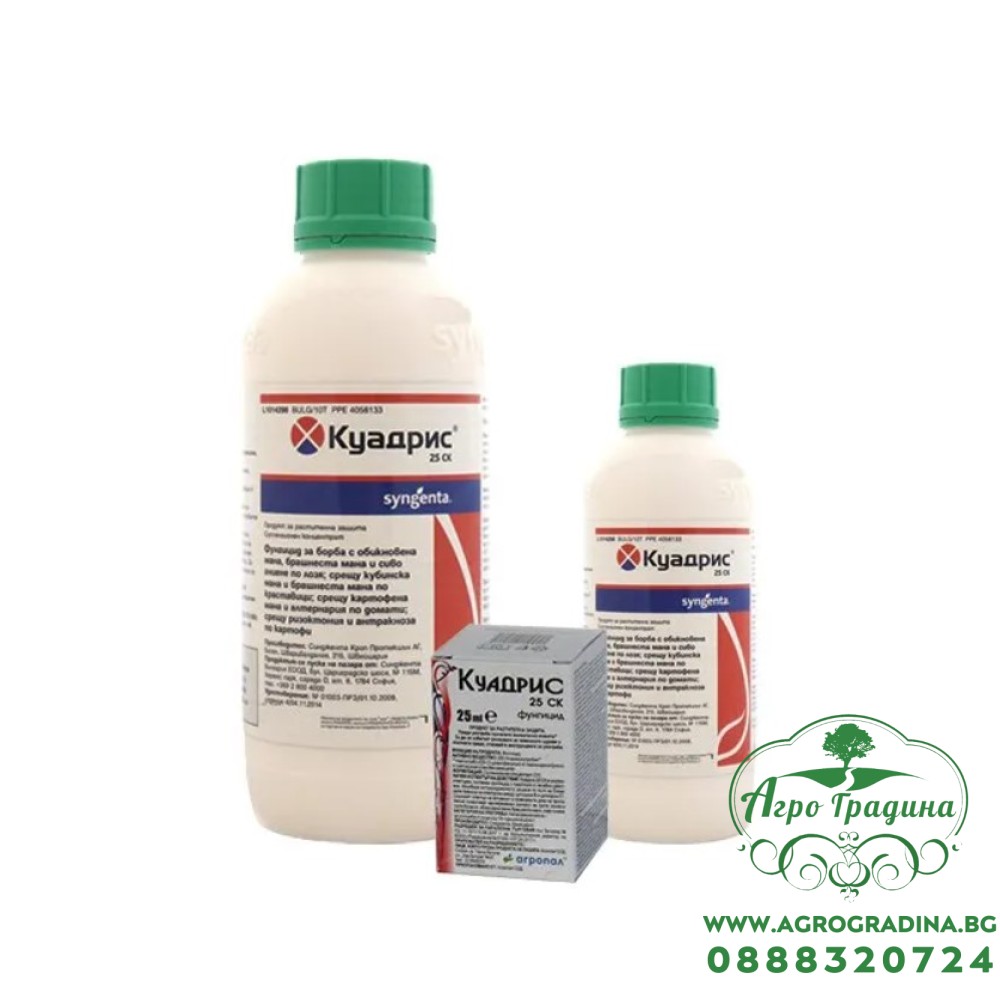 Куадрис 25 СК е високоефективен системен фунгицид от ново поколение с активно вещество азоксистробин – лидер в борбата срещу най-важните гъбни болести при зеленчуци и лозя. Продуктът осигурява надеждна защита срещу мана, алтернария, брашнеста мана, антракноза и други икономически значими патогени. Благодарение на бързото проникване и продължително действие, Куадрис гарантира чиста и здрава реколта, като същевременно подпомага растежа на културите чрез физиологичен „зелен ефект“. Подходящ както за полски, така и за оранжерийни условия.