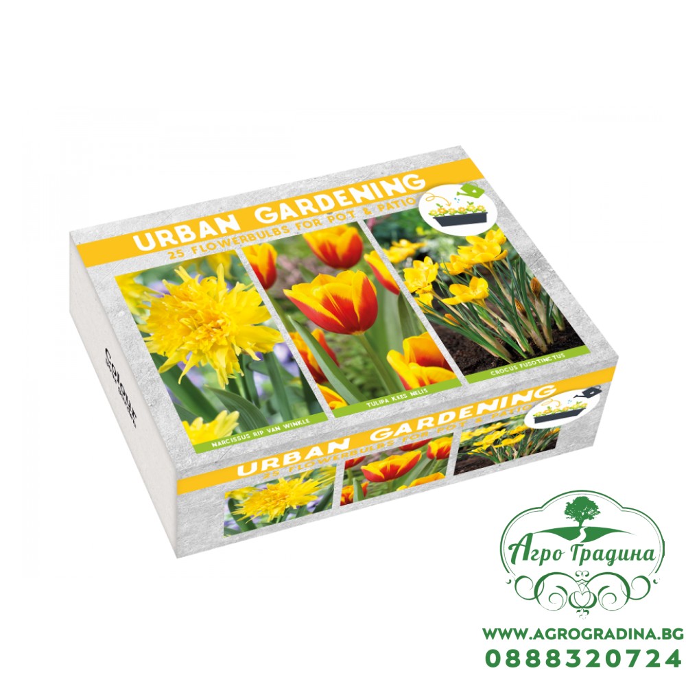 Комплектът Луковични цветя Урбан градина Жълто съдържа 5 x лалета Kees Nelis, 5 x нарциси Rip Van Winkle и 15 x минзухари Crocus fuscotinctus. Цветята цъфтят постепенно от началото на април до края на май в зависимост от климатичните условия. Могат да останат на едно място 3–4 години без пресаждане. Идеални за слънчеви, защитени от вятър лехи с неутрална почва.