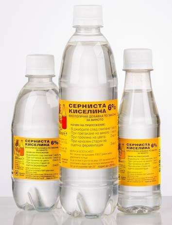 ЗАЩО Е НУЖНО ДА СЛАГАМЕ СЕРНИСТА КИСЕЛИНА? Направата на качествено вино е немислима без нужните дози серниста киселина. Силното и антисептично действие убива и потиска всички оцетно-кисели бактерии и диви. Дрожди, които могат да вкиснат вашето вино. По време на мачкане на гроздето добавете мл/л серниста киселина към гроздовата каша, а при загнило грозде 1,5-2 мл/л.