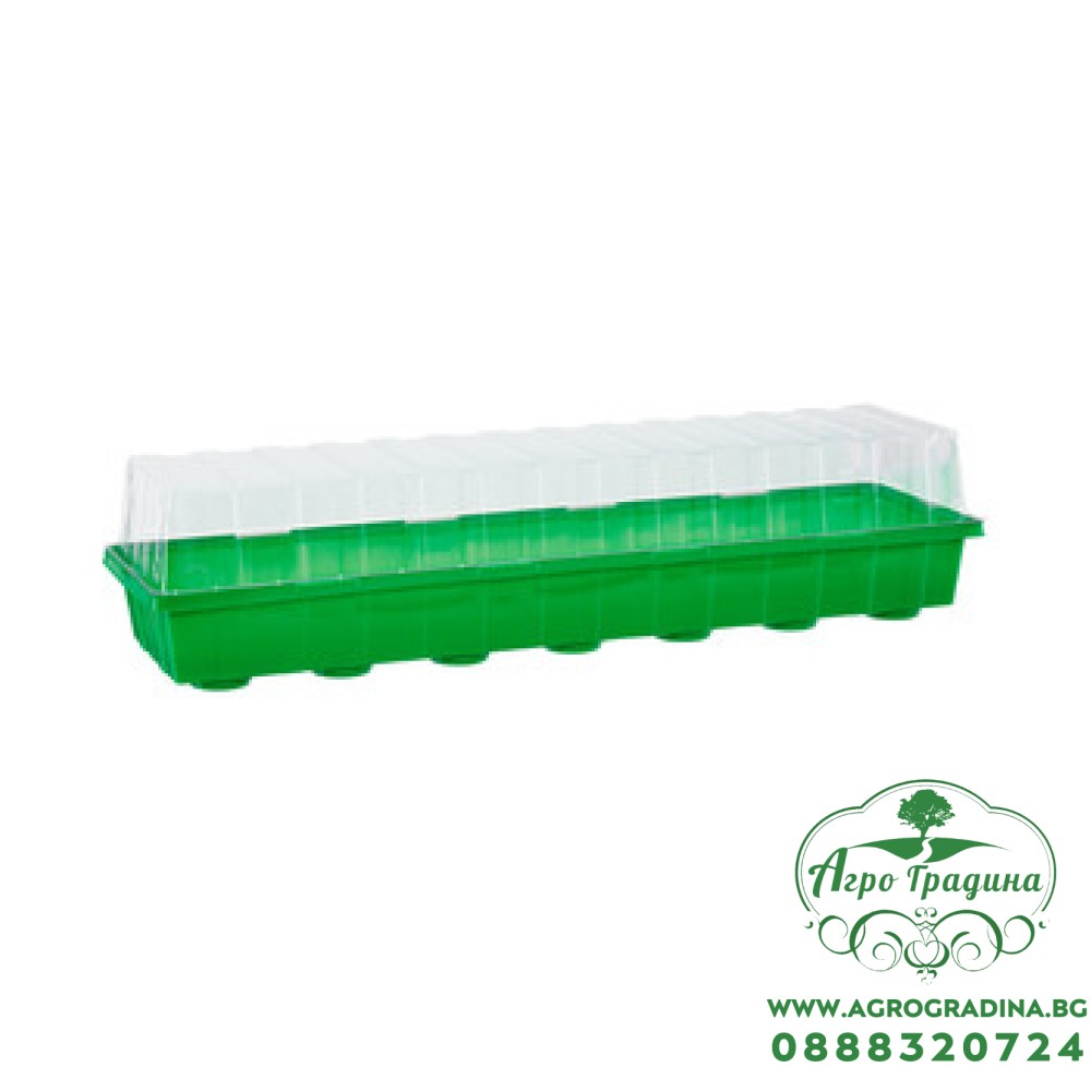 Тази мини оранжерия е зелена на цвят, има удължена форма и е много подходяща за поставяне на парапет или на по тесни и издължени части. Оранжерията се състои от 2 части - подложка за събиране на водата и прозрачен капак. Тя е предназначена за многократна употреба и е подходяща за отглеждане на всякакви видове разсад за зеленчуци, плодове и цветя.