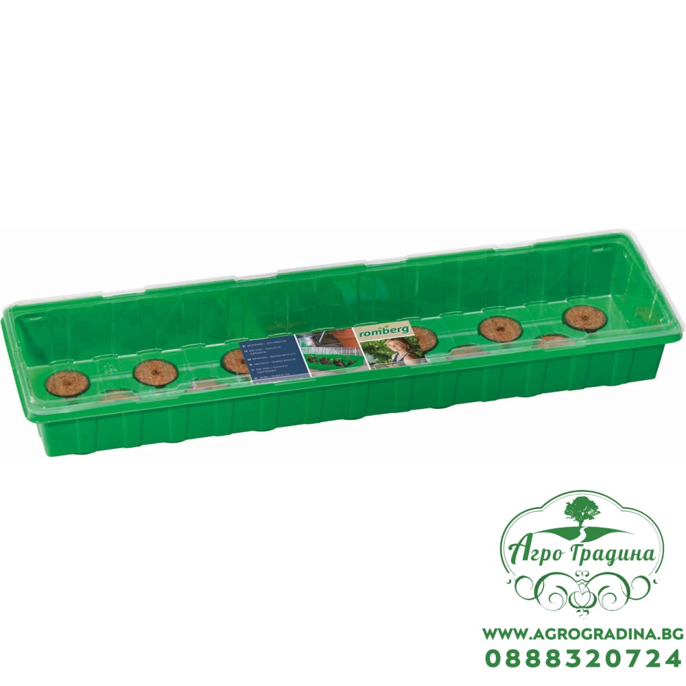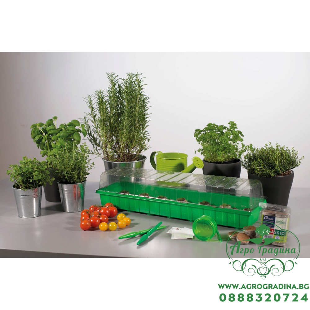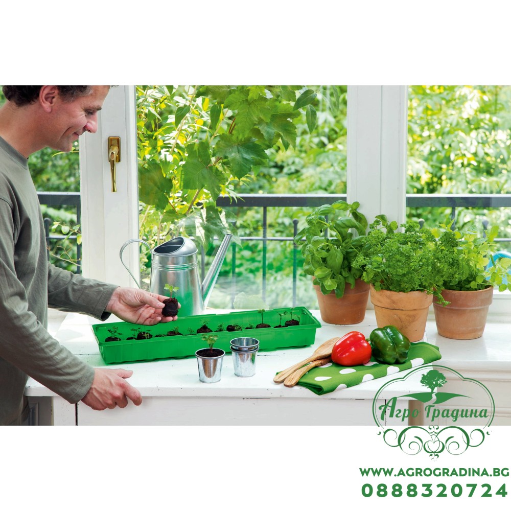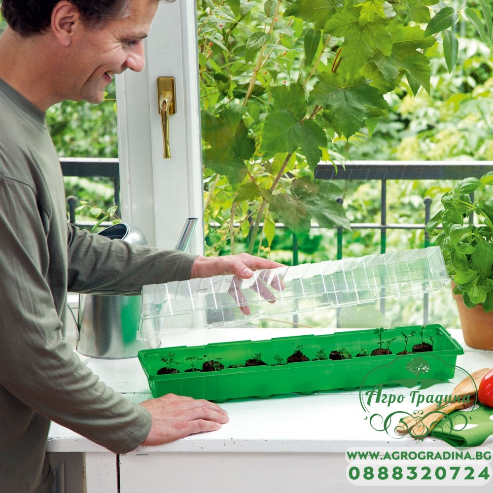 В нашият онлайн магазин Agrogradina.bg може да намерите различни видове работни форми, табли за разсад и мини оранжерии. Тази мини оранжерия е зелена на цвят, има удължена форма и е много подходяща за поставяне на парапет или на по тесни и издължени части. Оранжерията се състои от три части - подложка за събиране на водата, торфени шайби за засаждане и прозрачен капак. Тя е предназначена за многократна употреба и е подходяща за отглеждане на всякакви видове разсад за зеленчуци, плодове и цветя.