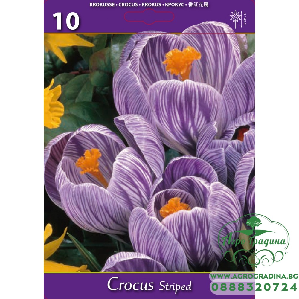 Crocus Striped е разновидност на минзухара (Crocus), която се отличава със своите цветове, които имат характерни ивици или линии. Минзухарите са малки, луковични цветя, които цъфтят през ранната пролет или есента и са известни със своите ярки цветове и компактна форма.