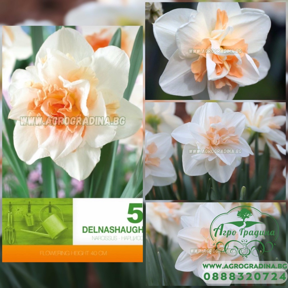 Narcissus Delnashaugh е сорт известен със своите уникални и атрактивни цветове. Той е двуцветен и с двойни цветове, което означава, че вместо обичайните шест венчелистчета, цветът има допълнителни редове от венчелистчета, създавайки по-пищен и пълен вид.