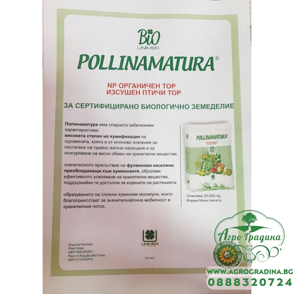 Онлайн магазин agrogradina.bg представя Полинаматура NP органичен изсушен птичи тор за сертифицирано биологично земеделие Bio Unimer 25 кг.