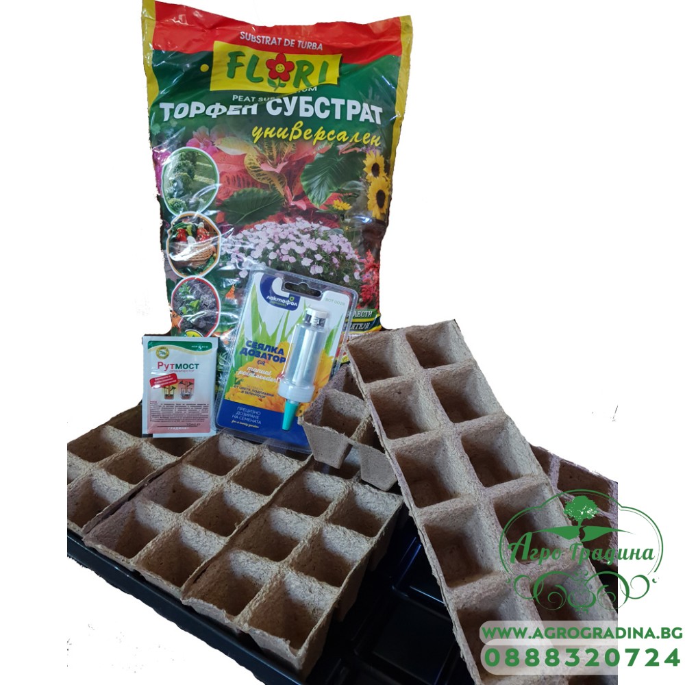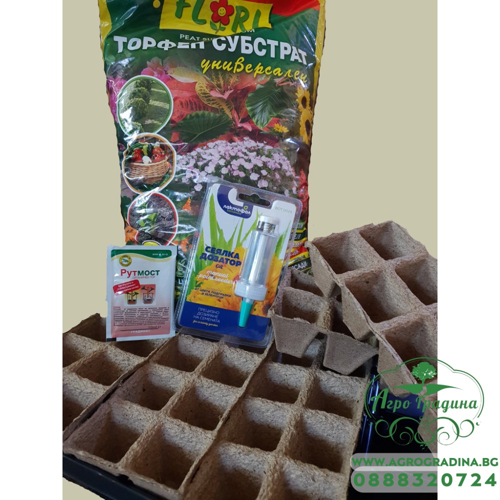 Този пакет ще ви улесни максимално при направата на разсад за различни видове плодове, зеленчуци, билки и цветя, като домати, краставици, тиквички, пипер и много други. Комплекта включва торфен субстрат 10л., торфени саксий за разсад, подложна табла, сеялка с дозатор и Биостимулатор за по-добра кълняемост и мощно коренова система. Торфеният субстрат е производство на Stender AG- Германия, представляващ уникална смес от тъмен и светъл торф с висока степен на угниване, допълнително обогатени с NPK торове, микроелементи, навлажнител, перлит и коригирано РН 5,5-6,5. Специалният състав на субстратите се характеризира с отличен дренаж и въздушен капацитет, издържат продължително време на преовлажняване и прекомерно засушаване, поддържат стерилна среда с пълна липса на болести, неприятели и нематоди, което ги прави универсално приложими. Торфените саксии са перфектно решение за всеки, които иска да отглежда своя разсад екологично чисто. Те са изработени от висококачествени материали и се разграджат в почвата след засаждане. Подложната табла за оттичане на водата е изработена от висококачествена плстмаса и е за МНОГОКРАТНА употреба.