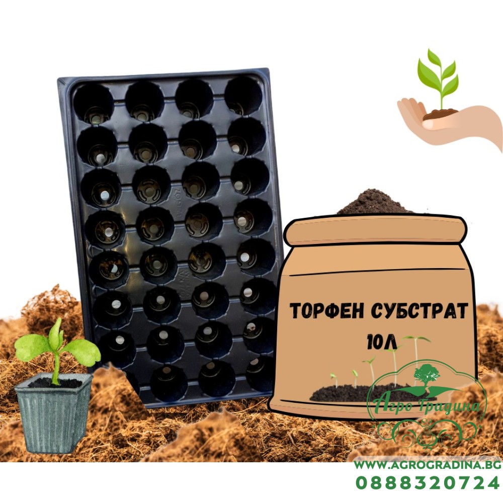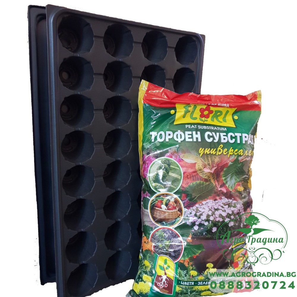 Този пакет ще ви улесни максимално при направата на разсад за различни видове плодове, зеленчуци, билки и цветя, като домати, краставици, тиквички, пипер и много други. Комплекта включва торфен субстрат 10л., работна табла за разсад и подложна табла. Торфеният субстрат представлява уникална смес от тъмен и светъл торф с висока степен на угниване, допълнително обогатени с NPK торове, микроелементи, навлажнител, перлит и коригирано РН 5,5-6,5. Специалният състав на субстратите се характеризира с отличен дренаж и въздушен капацитет, издържат продължително време на преовлажняване и прекомерно засушаване, поддържат стерилна среда с пълна липса на болести, неприятели и нематоди, което ги прави универсално приложими. Вие сами може да изберете броят на гнездата на таблата (28, 32 или 45 бр) в зависимост от това, което ще отглеждате.Тези табли са изработени от висококачествена пластмаса и са за МНОГОКРАТНА употреба.