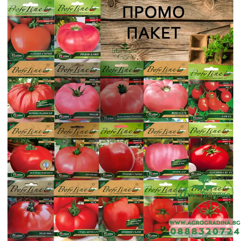 Този пакет съчетава в себе си невероятни български сортове домати, които ще ви изненада със своя вкус и качество. Ще може да отгледате и опитате най-предпочитаните и най-харесвани български сортове домати на пазара в последните години. Комплекта включва 18 сорта български домати.