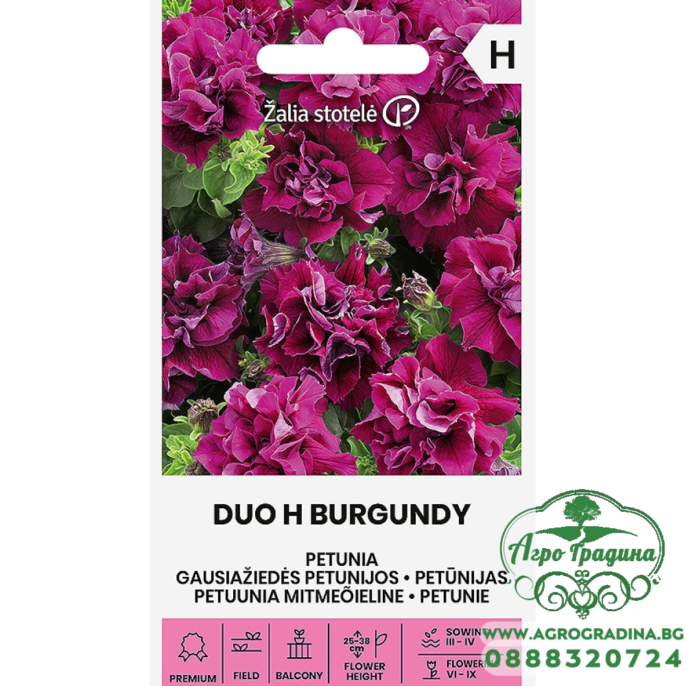 Онлайн магазин agrogradina.bg представяме на вашето внимание семена за Петуния Двойна Бордо / Petunia hybrida (Petunia double dou Н Burgundy) - сорт, който се отличава с красивите си двойни цветове в тъмно червено-бордо (бургундско) оцветяване. Този сорт петуния е популярен заради своето естетическо въздействие и изключителна декоративна стойност.