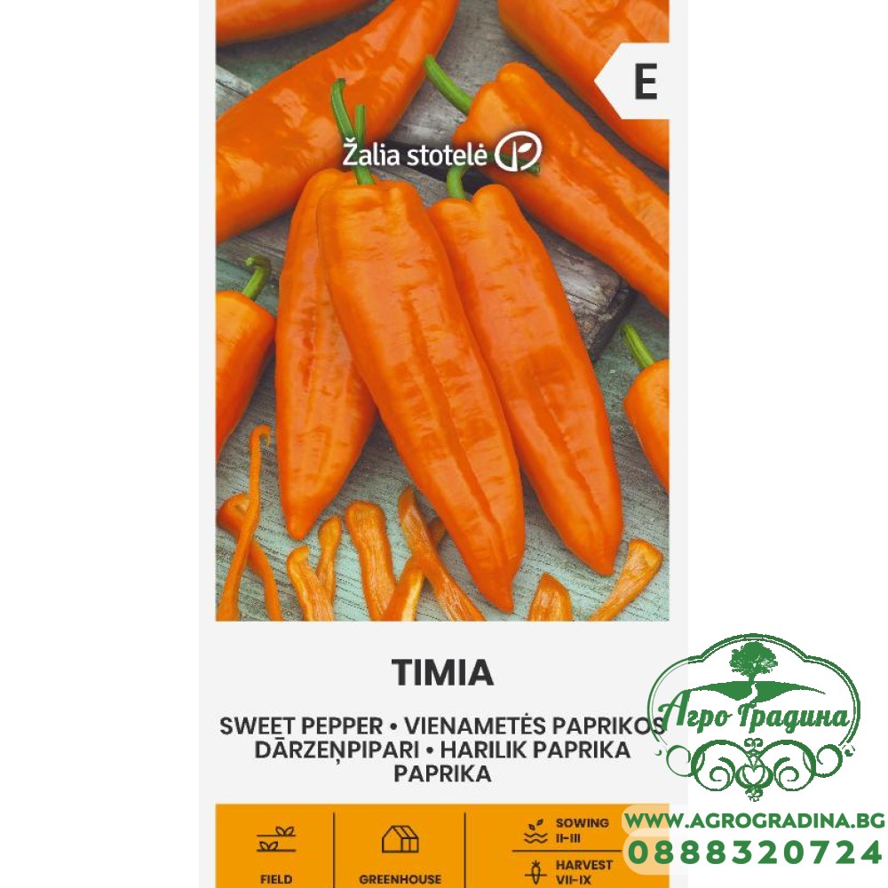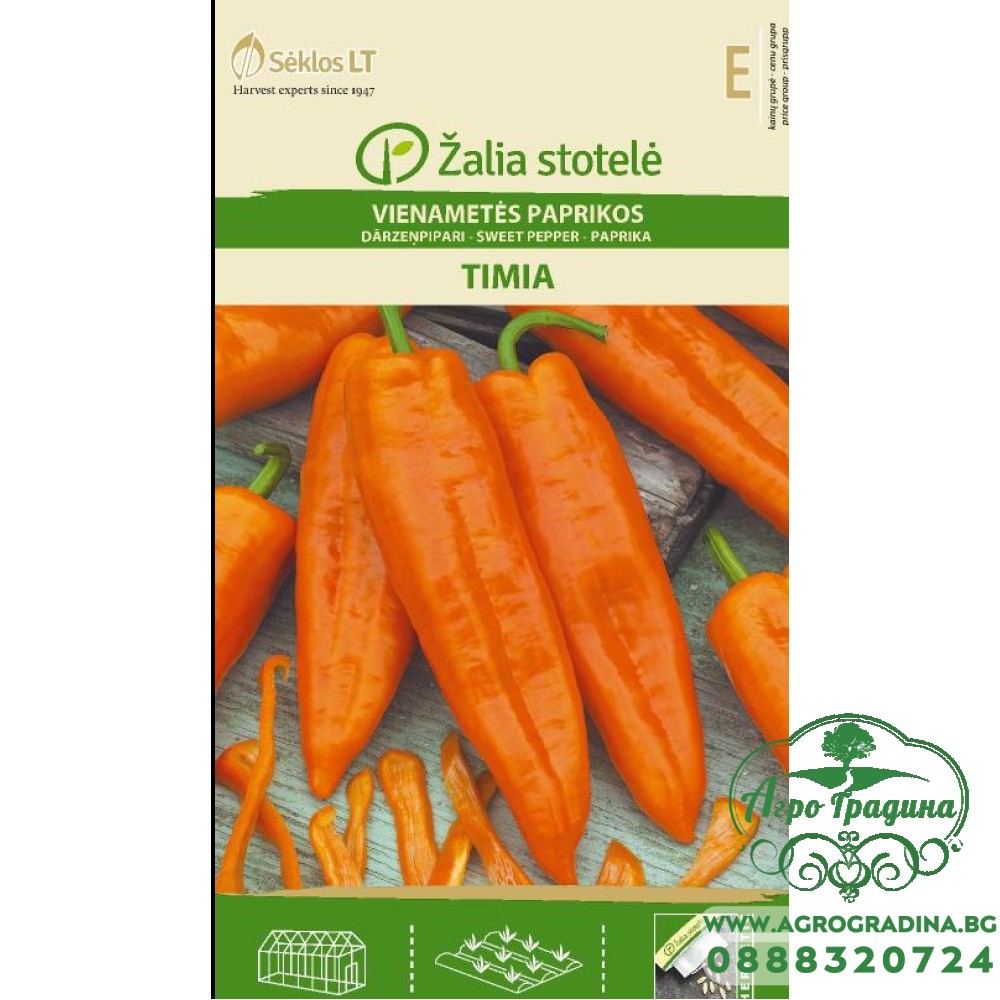 Пипер Тимиа / Timia Нашият онлайн магазин agrogradina.bg представя на вашето внимание семена за сладък Пипер Тимиа / Timia. Средно ранен, високодобивен сорт тип Капия. Плодовете са дълги 20-25 см, оранжеви и сладки... Прочети повече...