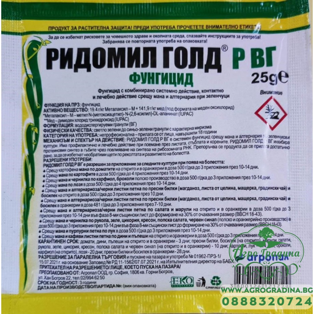 Ридомил Голд Р ВГ - комбиниран фунгицид с двойно действие - 25 гр Онлайн магазин agrogradina.bg предлага Ридомил Голд Р ВГ - комбиниран фунгицид с двойно действие за борба с гъбични заболявания по лозя, зеленчуци и ов... Прочети повече...