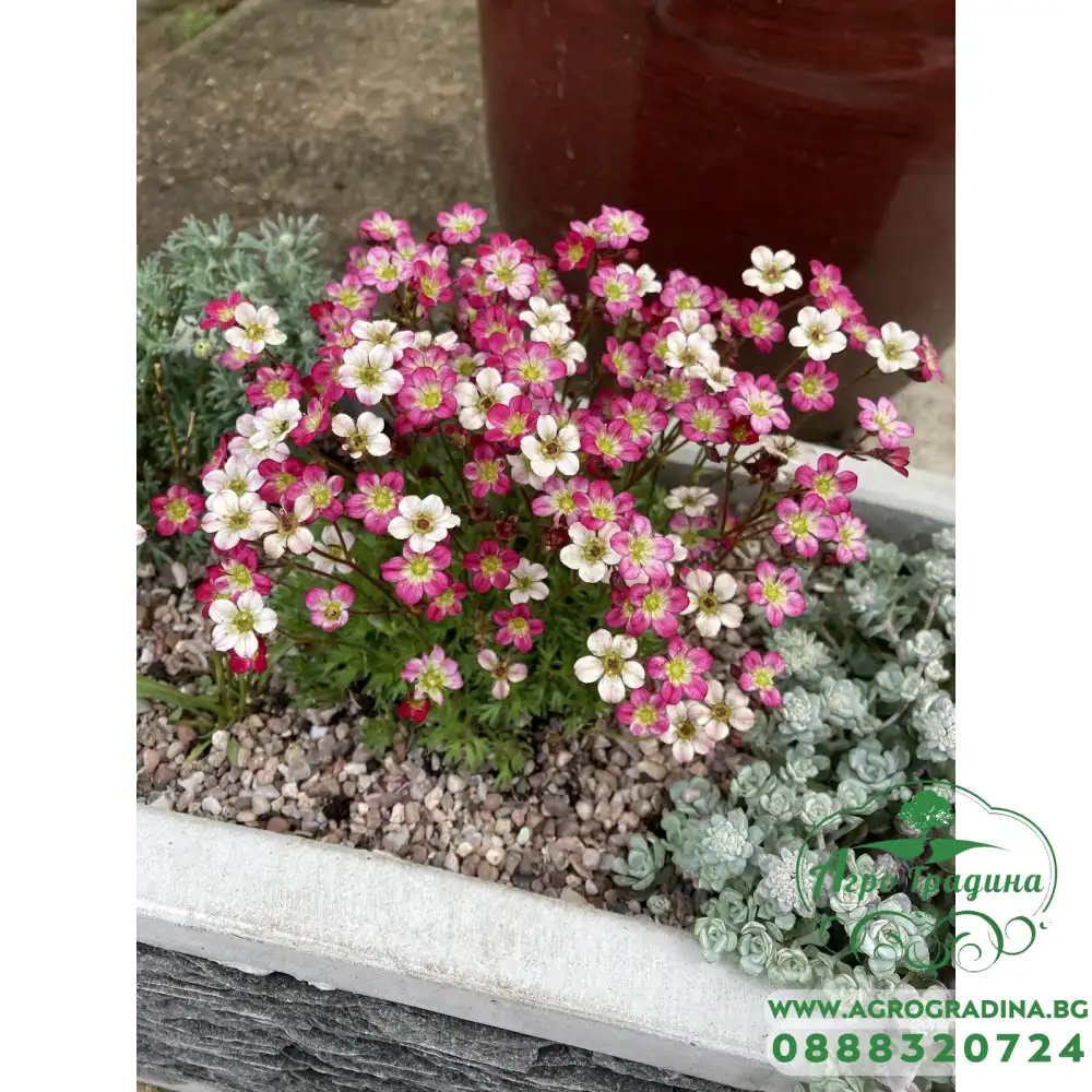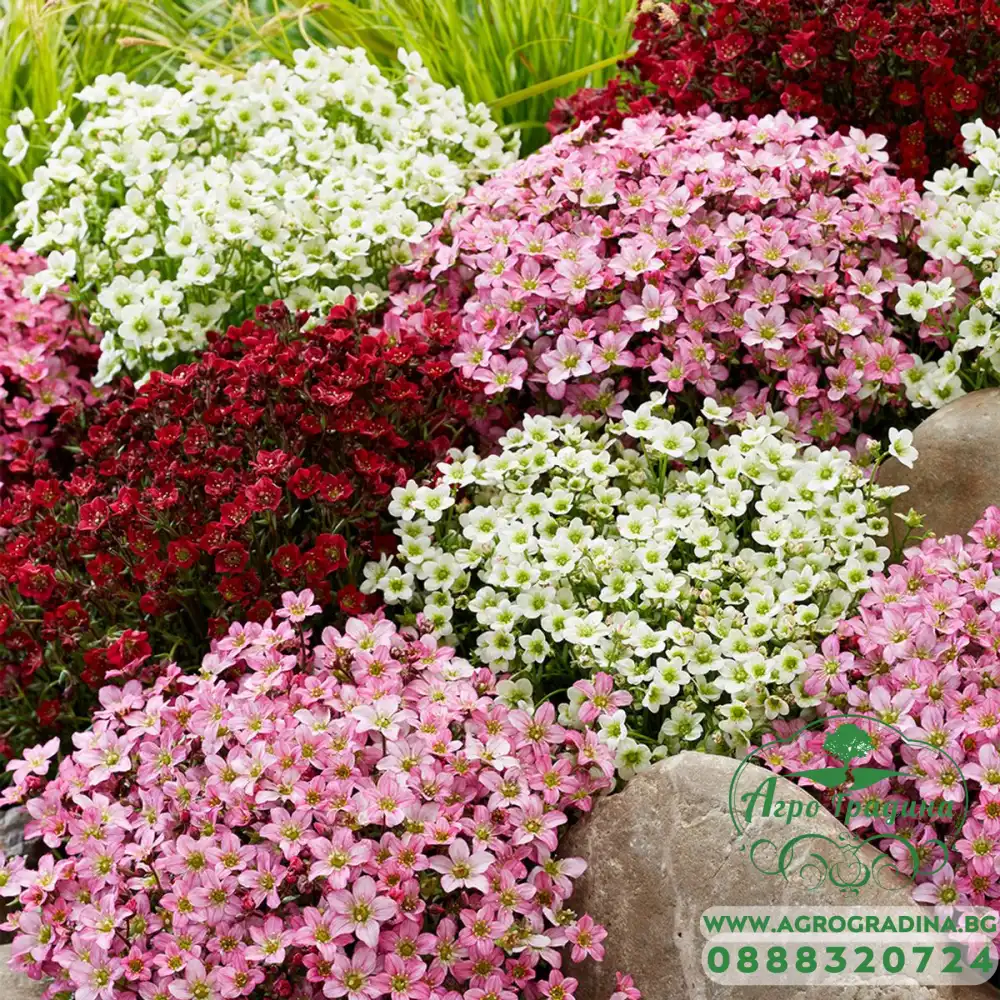 Онлайн магазин agrogradina.bg предлага семена за микс от цветове Саксифрага (Каменоломка) / Saxifraga arendsii - красиво многогодишно декоративно растение, което образува плътни, вечнозелени туфи с височина само няколко сантиметра. През пролетта растенията се покриват с многобройни цветове в бяло, розово и червено, създавайки ефектен цветен килим.
