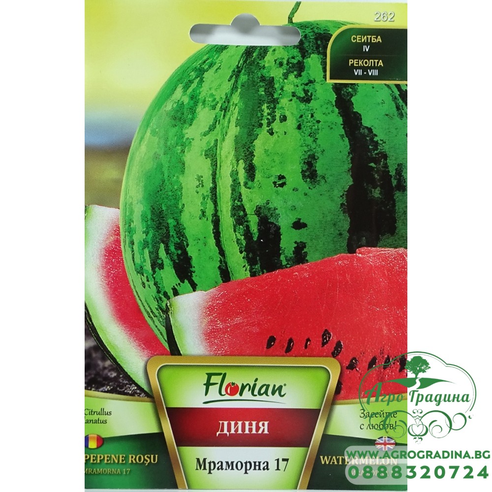 Нашият он-лайн магазин agrogradina.bg представя на вашето внимание семена за Диня Мраморна. Сорта се характеризира с отличните си вкусови качества.
