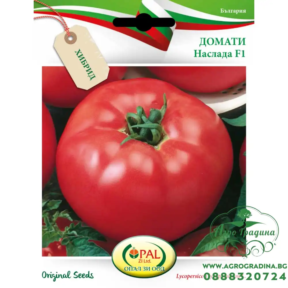Нашият он-лайн магазин agrogradina.bg представя на вашето внимание семена за домати сорт Наслада F1. Този сорт домати е подходящ за полско и оранжерийно производство. Плодовете са едри, плътни, средно твърди, месести и сочни.