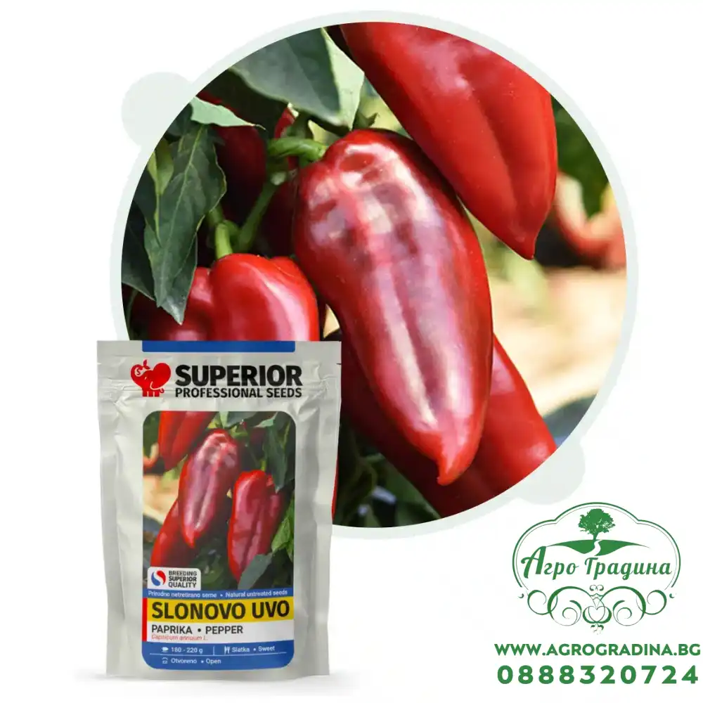 Нашият он-лайн магазин agrogradina.bg представя на вашето внимание семена за пипер сорт Слоново ухо. Този висококачествен сръбски сорт пипер формира изключително големи и вкусни плодове