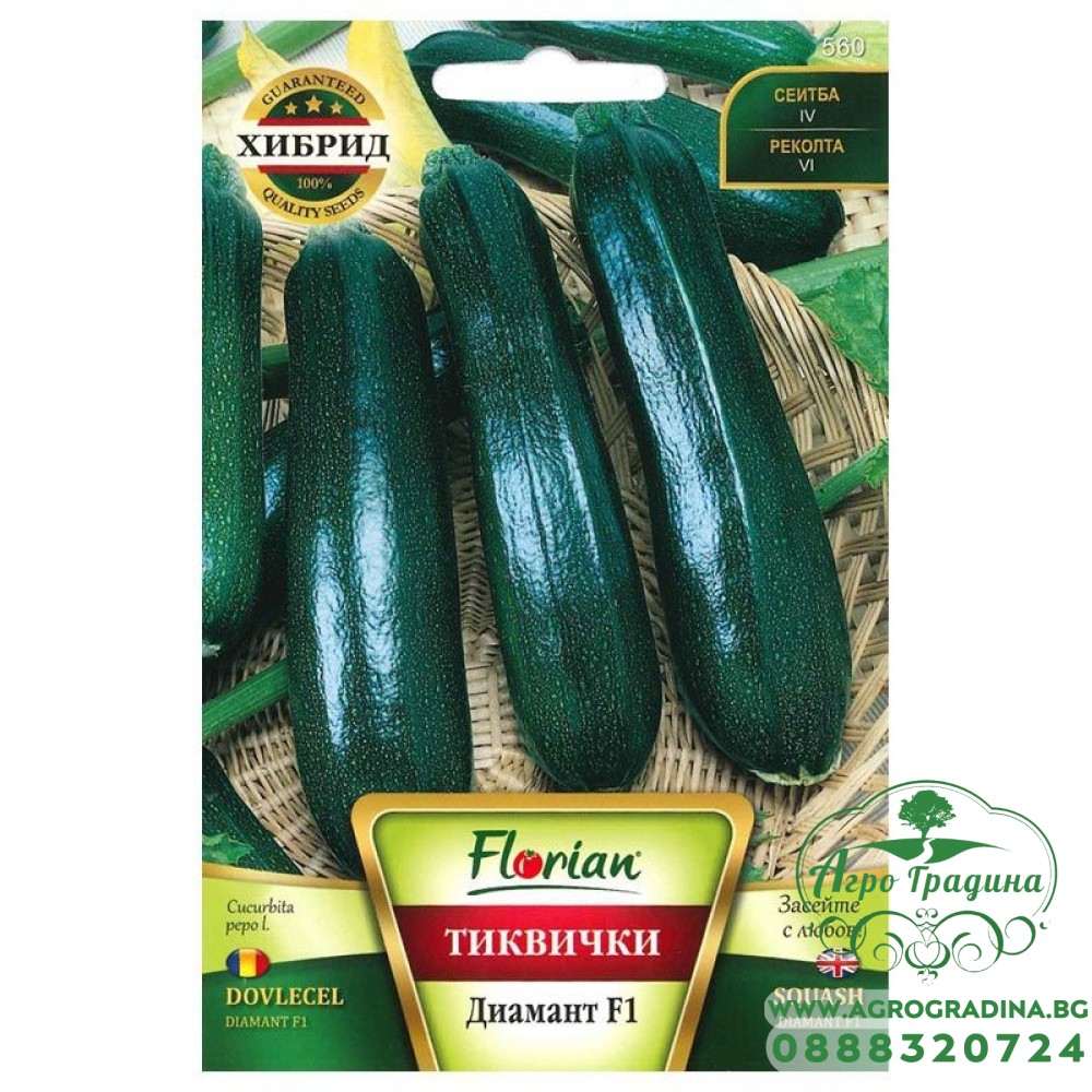 Тиквичка Диамант F1 На нашия онлайн магазин ви представяме тиквичка диамант. Този сорт тиквичка са тъмнозелени на цвят. Време на засяване за разсад от 20 до 30 април е периодът. Тъмно зелената тиквичка Диамант F1 ... Прочети повече...
