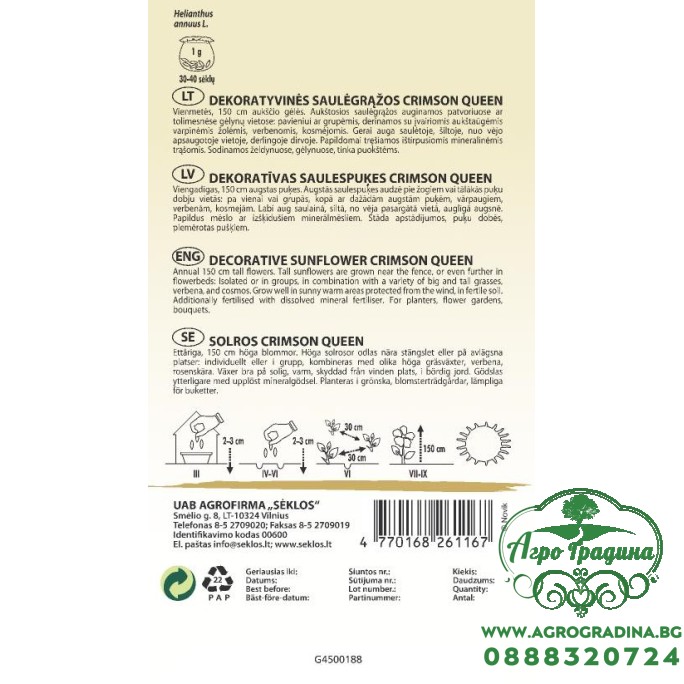 В нашият онлайн магазин www.agrogradina.bg може да намерите широка гама семена от различни видове цветя. Нашите семена са с гарантиран произход и качество, опаковани в трислойно алуминиево фолио с цел запазването на посевните качества. Изберете семена за вашата цветна градина. Тук ще откриете семена от различни видове градински цветя, интериорни растения, цъфтящи и листнодекоративни цветя, семена от екзотични видове, за засяване в саксии или в двора. Като най – големият професионален онлайн магазин за градината ще Ви представи професионални семена на цветя от български производители и сертифицирани висококачествени семена внос от Холандия, Германия, Италия, Полша и мн. др. Изберетей от многобройните предложения като астри,теменужка,виола,далия,декоративни тиквички,Делфиниум (Ралица),Ешолция (Калифорнийски Мак),Иберис,Импатиенс (циганче), Ипомея,калдъръмче,карамфил,Кобея,Космос,Кученце,Латинка,Петуния,Салвия,Тагетес,карамфил,хелиантус,хризантема,цения и много други.