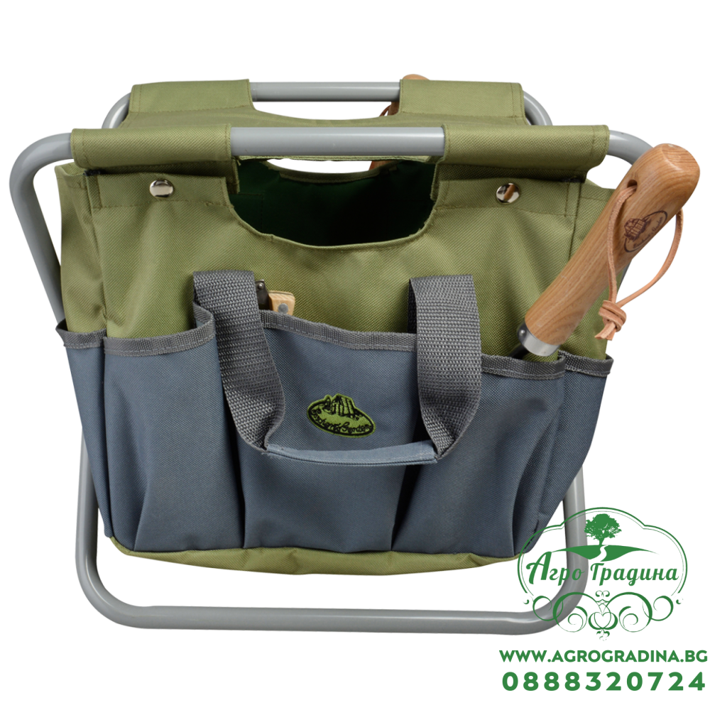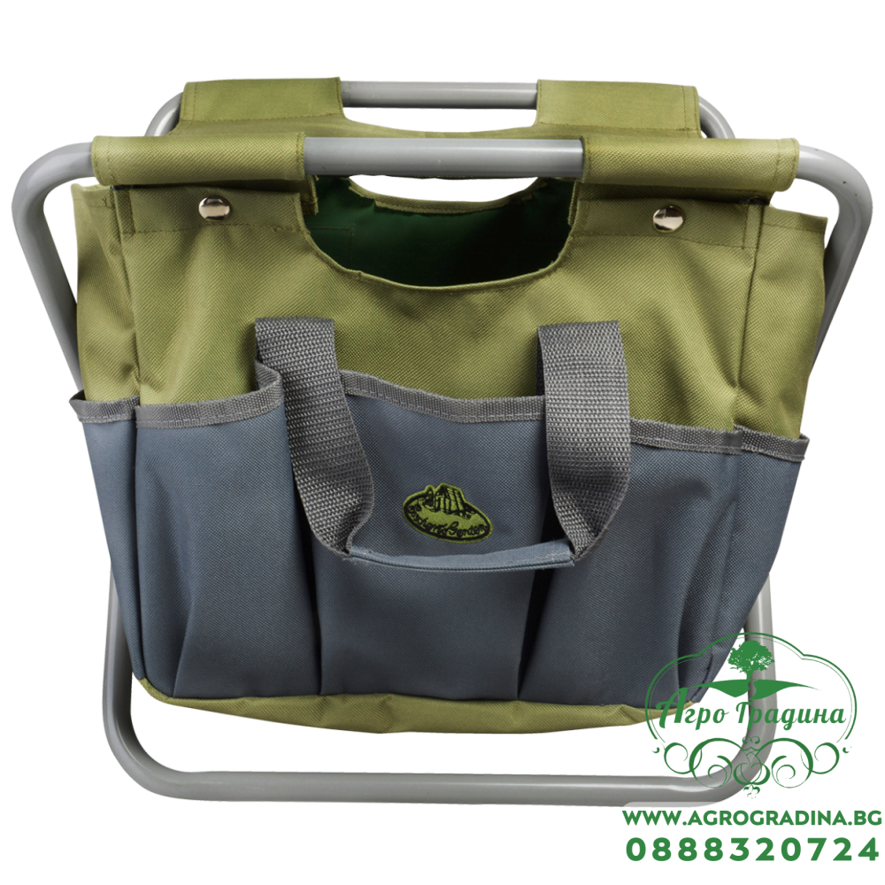 Онлайн магазин agrogradina.bg представя практичен сгъваем стол, тип табуретка, с чанта за инструменти, за да осигури максимален комфорт при извършването на градинските дейности.