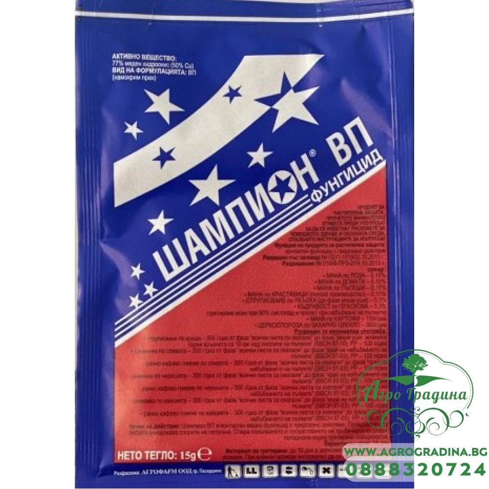 Шампион ВП 15 е медсъдържащ контактен фунгицид, предназначен за борба с гъбни и бактериални болести по различни култури. Ефективен срещу Мана (по лозя, домати, краставици, пъпеши), Картофена мана, Къдравост по праскови, Струпясване по ябълки, Ранно кафяво гниене, Сачмянка.