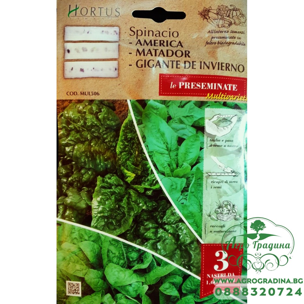 Нашият онлайн магазин agrogradina.bg представя на вашето внимание семена от серията „Le Preseminate“  Семена на Лента за три вида Спанак (America, Matador, Gigante de Invierno)  / Spinacio Multivarieta. „Le Preseminate“ са семена, които вече са поставени в биоразградима лента, идеално разположени едно от друго, за много лесно засяване и идеалното развитие на растенията.