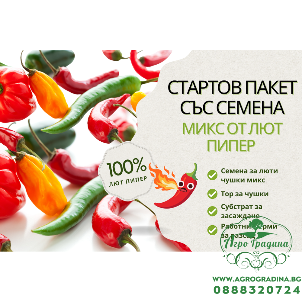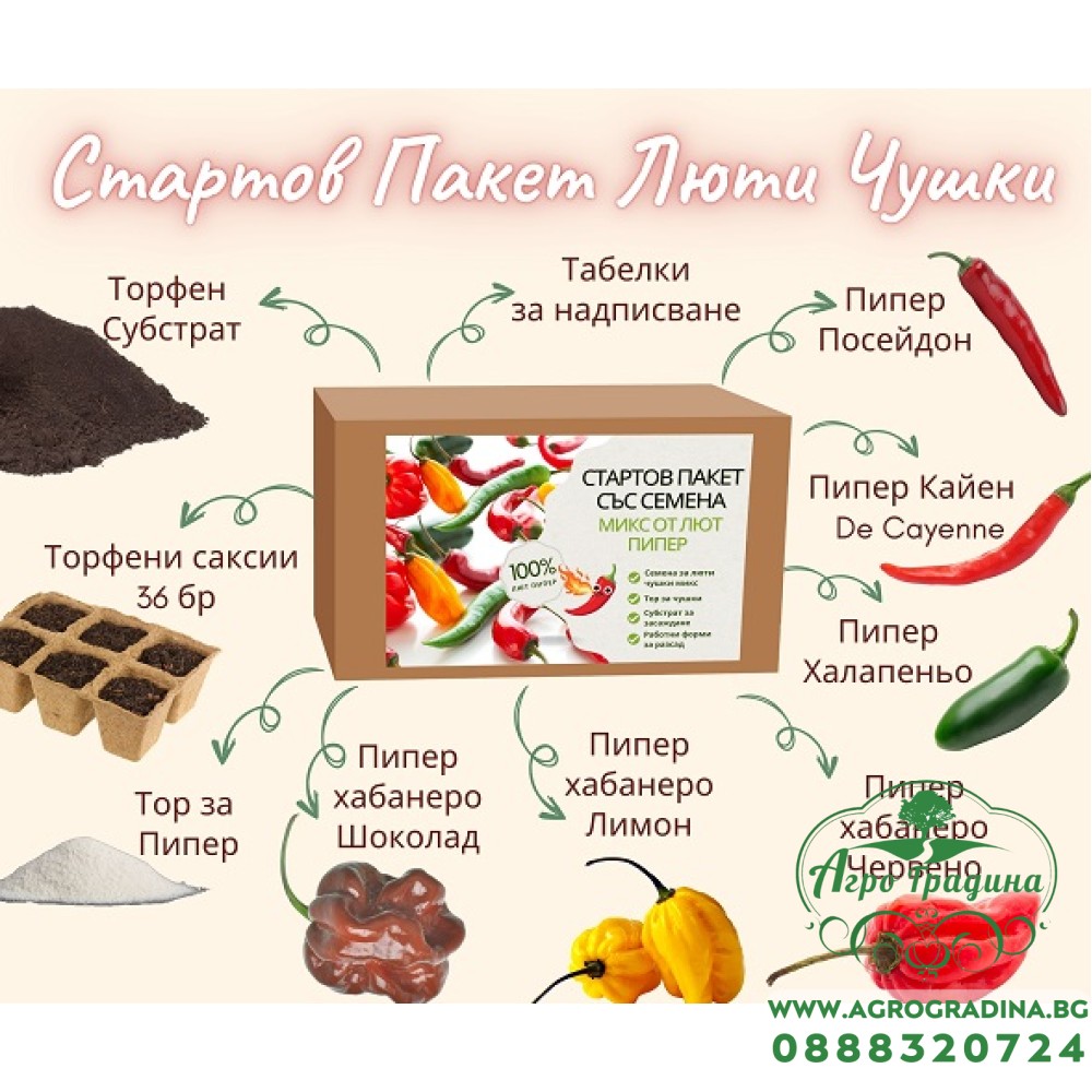 Стартов пакет за любителите на люти чушки Нашият стартов пакет е идеално решение за всички, които искат да зарадват себе си или приятел - любител на лютите чушки! Всичко необходимо за успешно отглеждане на люти чушки ... Прочети повече...
